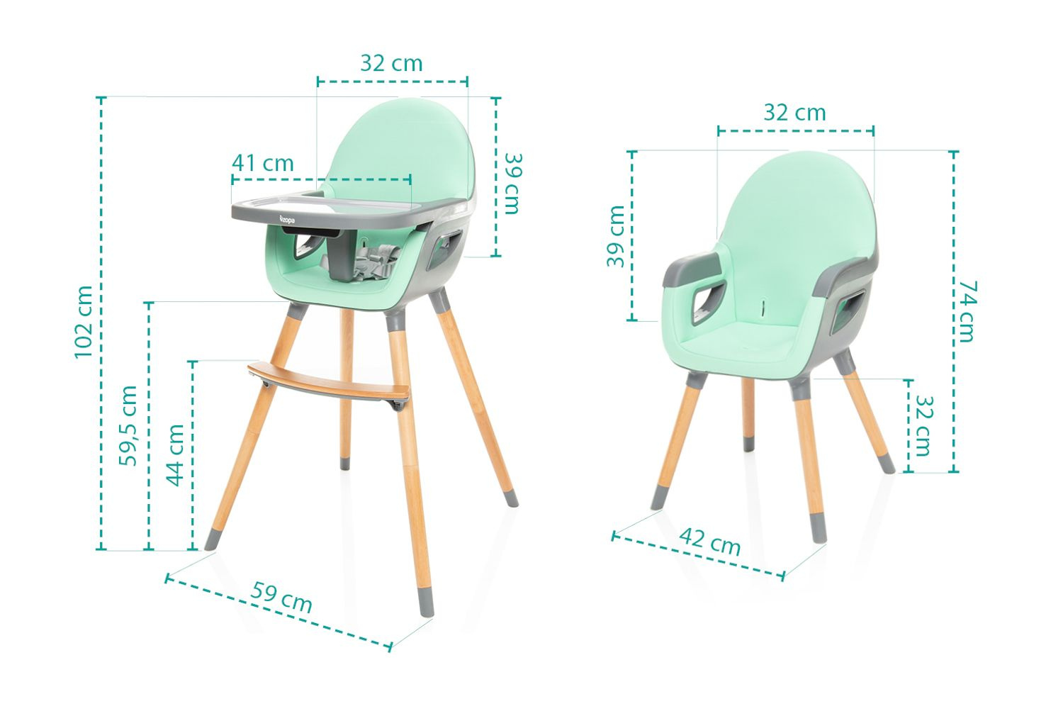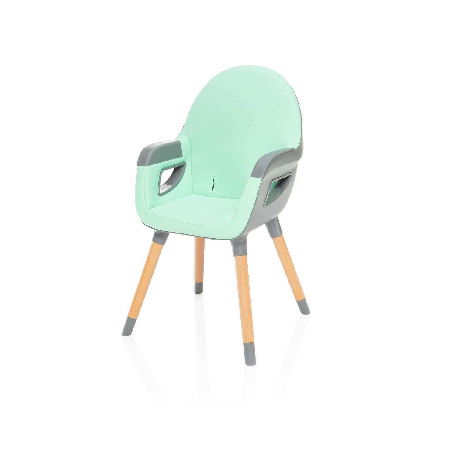 Na výběr je několik barevných variant v minimalistickém designu, díky čemuž židlička hravě zapadne do jakéhokoliv interiéru. Použít ji lze jako klasickou jídelní židli nebo po snížení výšky a odstranění pultu jako křesílko do dětského pokoje. Pro pohodlné přenášení je židlička vybavena praktickými madly.