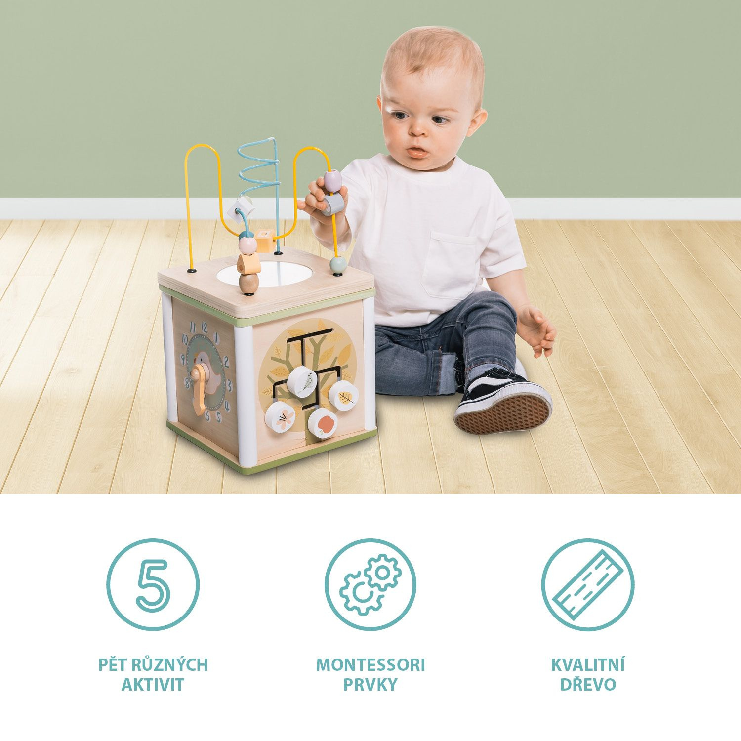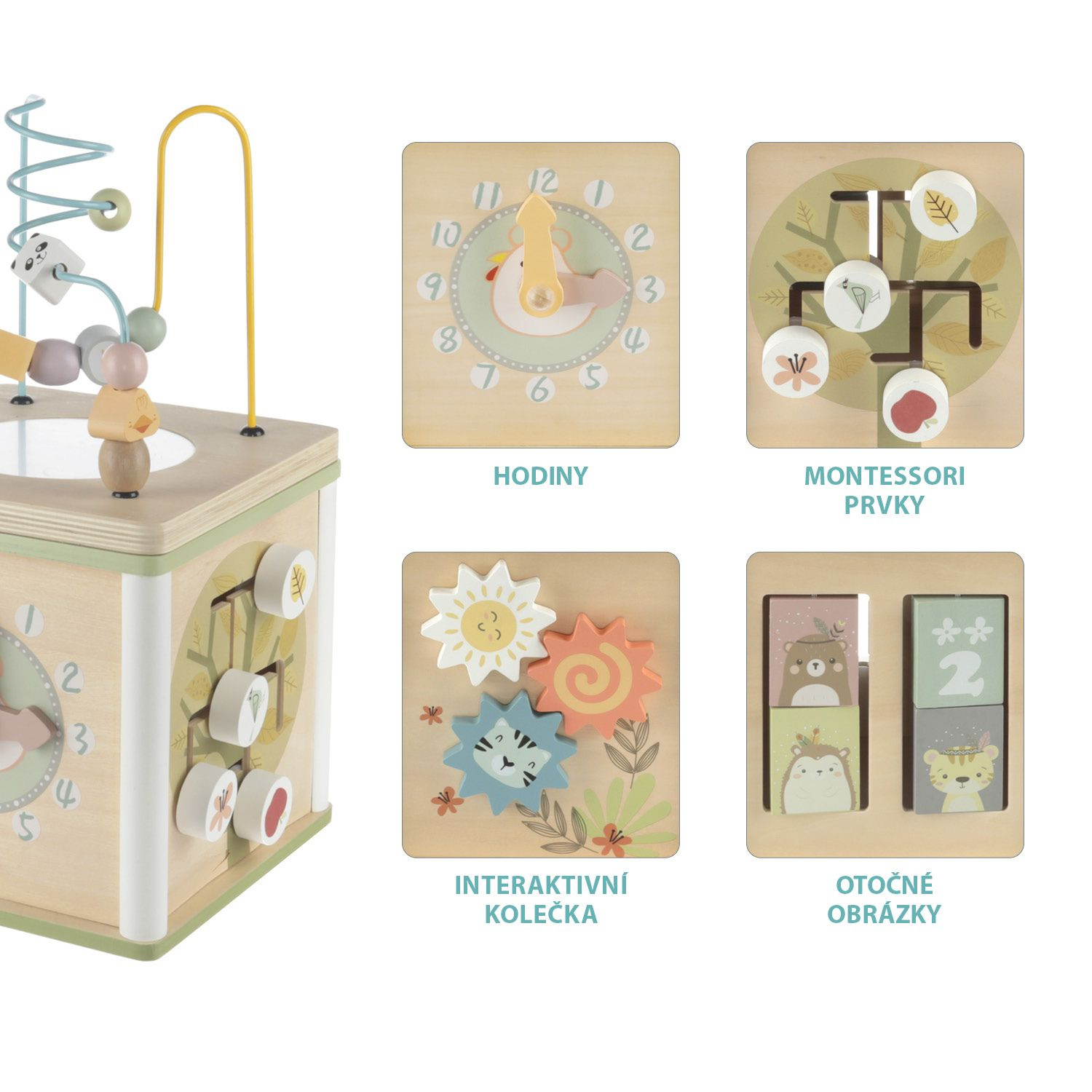 Roztomilá kostka, která v sobě ukrývá aktivity skládačku. Po stranách kostky jsou otočné dřevěné tvary s různými motivy. Hračka rozvíjí koordinaci, prostorovou představivost a dovednost rukou. Posouvání kuliček a tvarů také může děti naučit prvnímu počítání a rozpoznávání barev. Aktivity jsou vyrobené z kvalitního dřeva a barev na vodní bázi.