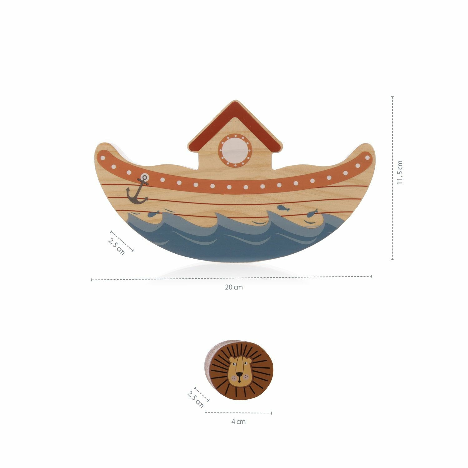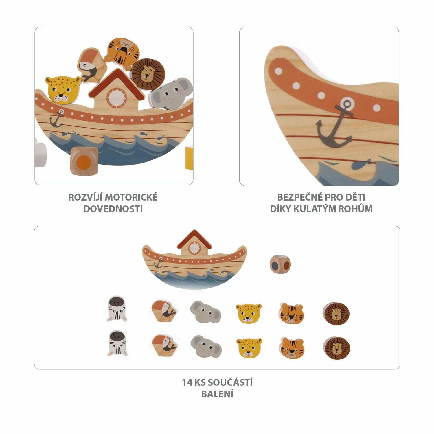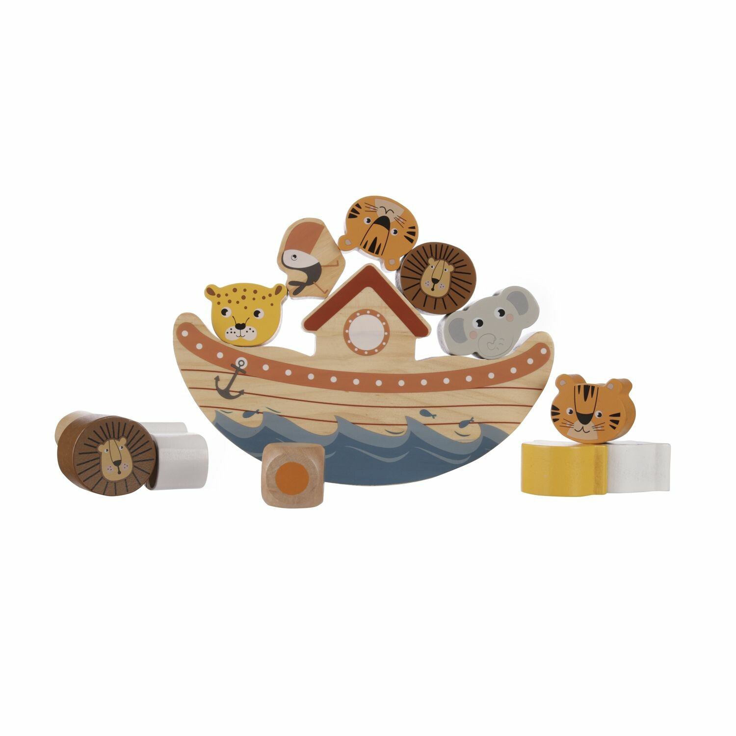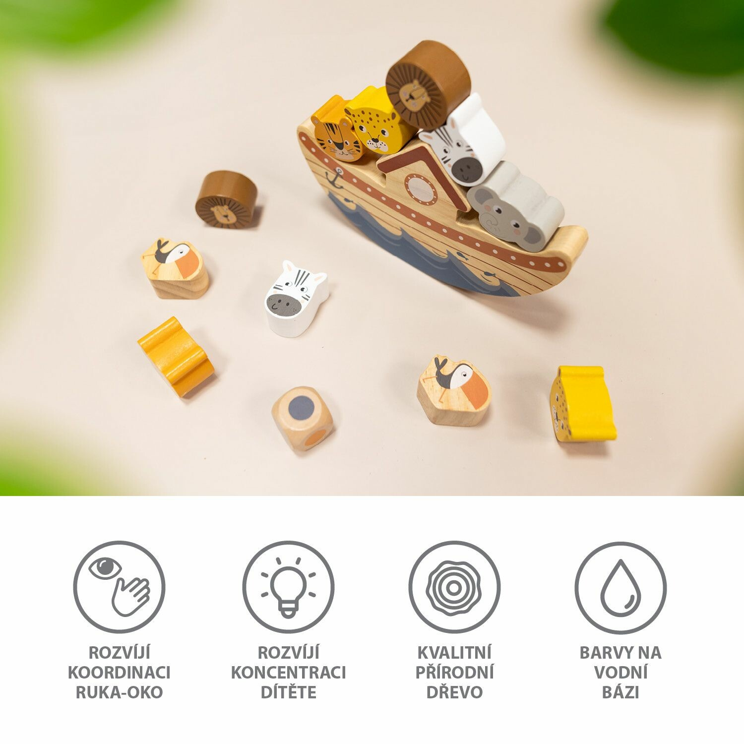 Hrajte sami nebo ve více lidech, děti, dospěli, babičky, dědečkové – tahle zábavná hra bude bavit všechny! Postupně naloďte všechna dřevěná zvířátka na palubu, ale pozor! Čím více zvířátek na palubě je, tím více hrozí, že se archa převrhne, nebo zvířátka z lodi vypadnou!