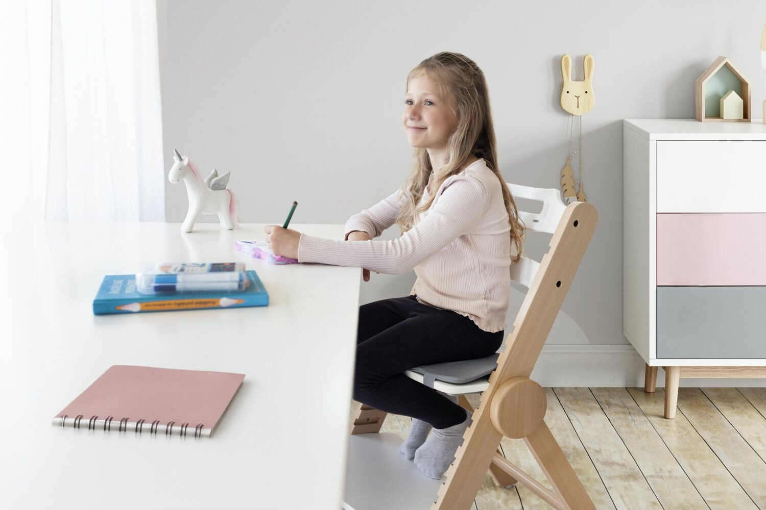 Rostoucí dětská židlička, výškově nastavitelné sedátko a podnožka, nastavitelná bez nářadí, skládací, z bukového dřeva – to je