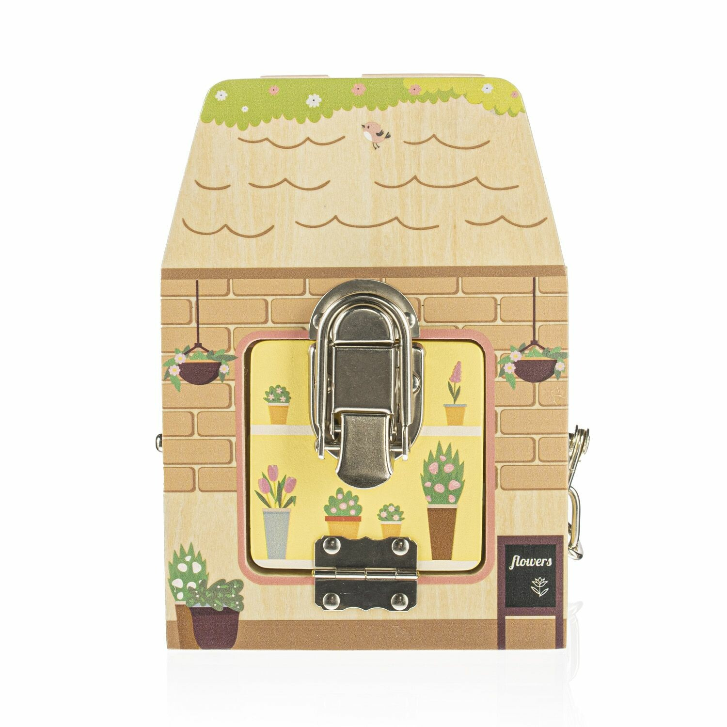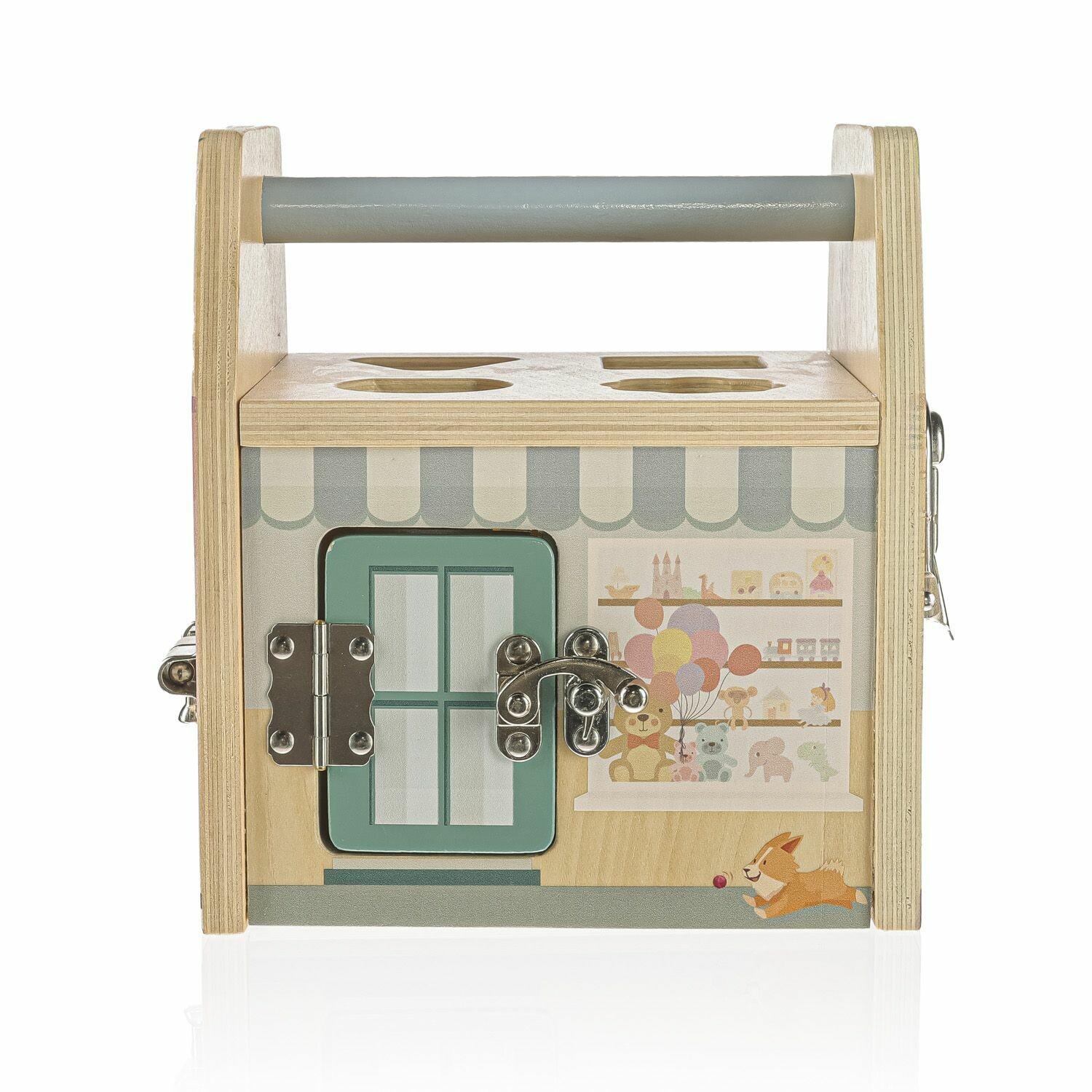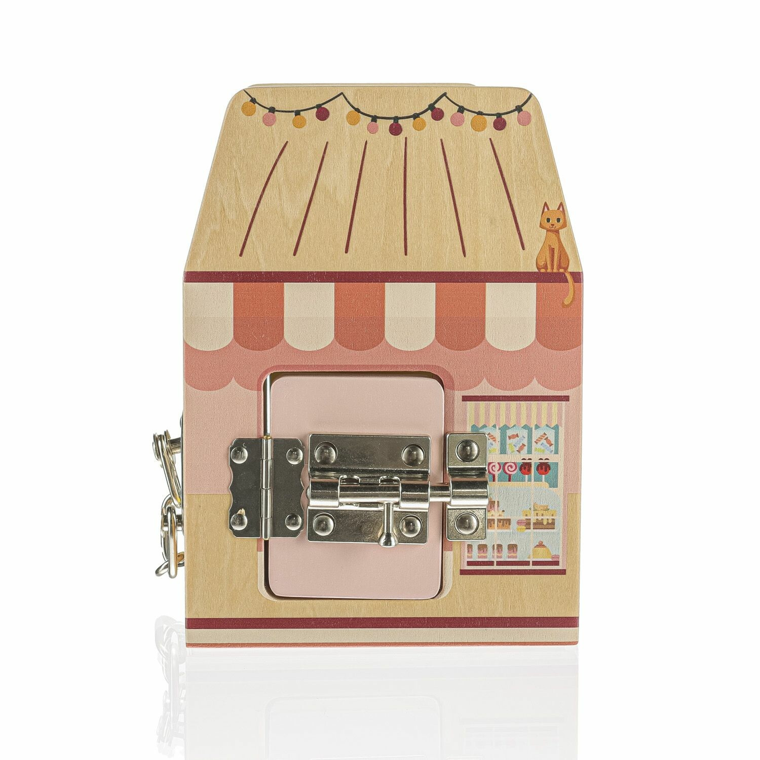 Každá strana této dřevěné kostky představuje jiný obchod a každý obchod, jak se patří má svůj speciální zámek proti lupičům. Děti se hraním si se zámečky učí logickému a prostorovému vnímání.
