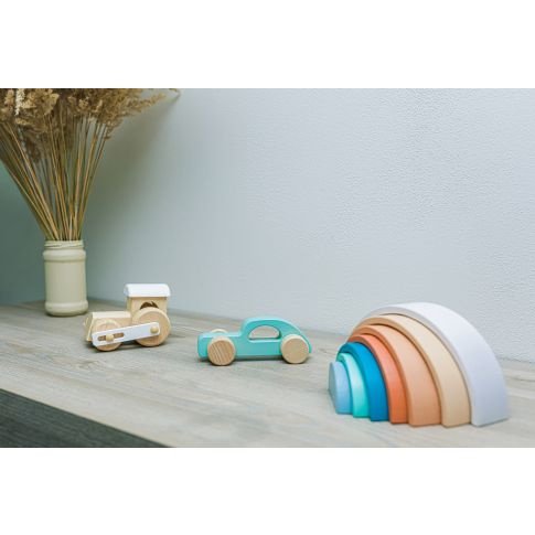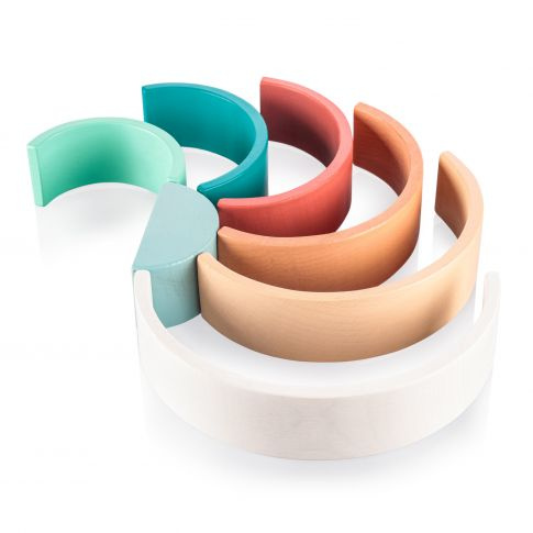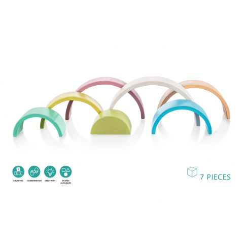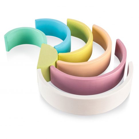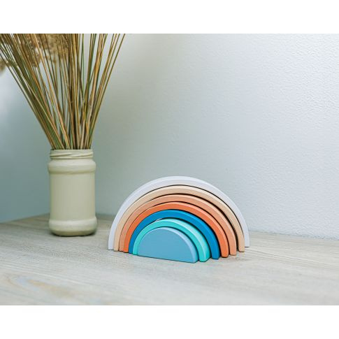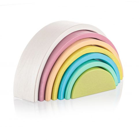 Dřevěná duha v pastelových barvách.