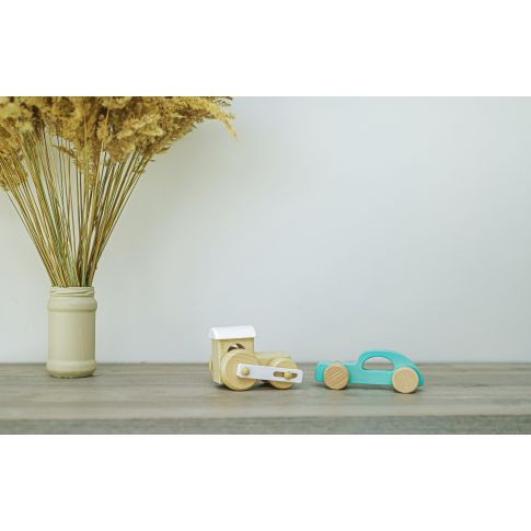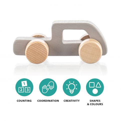 Hračka je vyrobena z kvalitního bukového dřeva a barev na vodní bázi. Odolná kolečka zvládnou jízdu po koberci, podlahách, ale i na dětských hřištích či trávě, pokud se dítě rozhodne vzít si autíčko ven.
