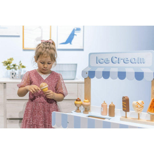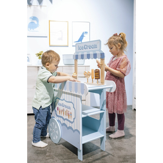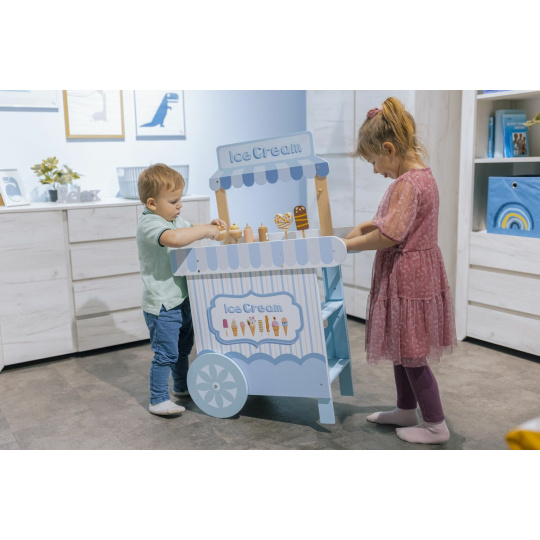 Lahodnou zmrzlinu si teď můžou vaše děti dopřát nejen v létě. Tento propracovaný a barevně laděný set je navržen tak, aby rozvíjel kreativitu, představivost a podporoval hravé hraní rolí. Nádherně vyladěný vozík připomínající prodejnu zmrzliny je připraven vyrazit na cestu do dětského světa fantazie. Děti si zamilují jeho autentický design a jednoduché ovládání. Děti si mohou vychutnat roli skutečného zmrzlináře s porcovacím nástrojem, který jim umožní tvořit dokonalé a lákavé porce jejich oblíbené zmrzliny. Sada obsahuje i mrazící box, který slouží jako hračka a pomůže dětem předstírat, že jejich zmrzlina je vždy čerstvá a chladivá.