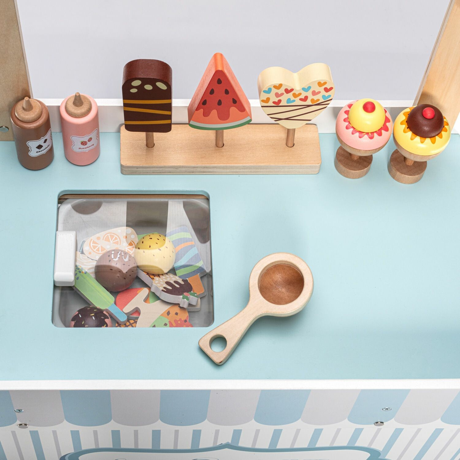 Velká dřevěná hračka, odolné dřevo, netoxické barvy, kopečkovač na zmrzlinu, kornoutky, kopečky zmrzliny, mrazící box, hodiny zábavy – to je Dřevěné zmrzlinářství set.