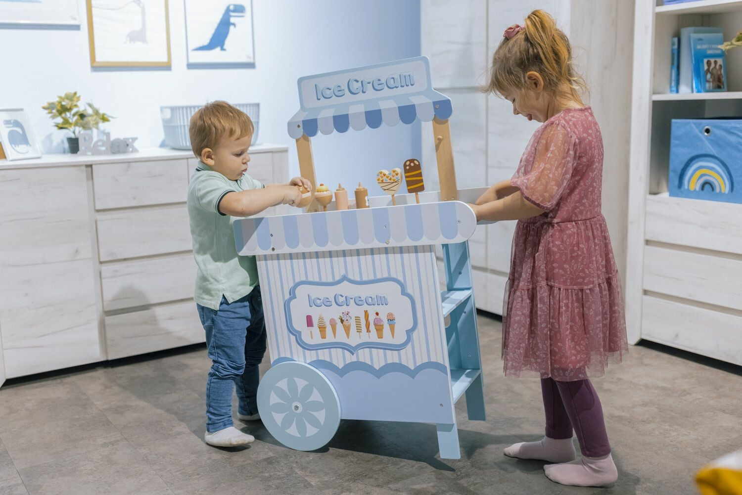 Lahodnou zmrzlinu si teď můžou vaše děti dopřát nejen v létě. Tento propracovaný a barevně laděný set je navržen tak, aby rozvíjel kreativitu, představivost a podporoval hravé hraní rolí. Nádherně vyladěný vozík připomínající prodejnu zmrzliny je připraven vyrazit na cestu do dětského světa fantazie. Děti si zamilují jeho autentický design a jednoduché ovládání. Děti si mohou vychutnat roli skutečného zmrzlináře s porcovacím nástrojem, který jim umožní tvořit dokonalé a lákavé porce jejich oblíbené zmrzliny. Sada obsahuje i mrazící box, který slouží jako hračka a pomůže dětem předstírat, že jejich zmrzlina je vždy čerstvá a chladivá.