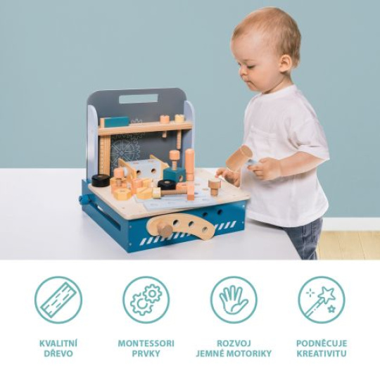 Kompaktní skládací ponk má velké množství dřevěných komponentů od dřevěných destiček s dírkami, po šroubky a matky. Díky nepřebernému množství skládacích možností podněcuje dětskou mysl a podporuje kreativní myšlení. Také rozvíjí jemnou motoriku a základní koordinaci rukou. Skládací ponk je vyrobený z kvalitního dřeva a barev na vodní bázi.
