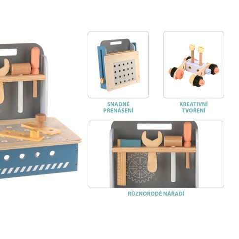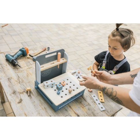 Kompaktní skládací ponk má velké množství dřevěných komponentů od dřevěných destiček s dírkami, po šroubky a matky. Díky nepřebernému množství skládacích možností podněcuje dětskou mysl a podporuje kreativní myšlení. Také rozvíjí jemnou motoriku a základní koordinaci rukou. Skládací ponk je vyrobený z kvalitního dřeva a barev na vodní bázi.