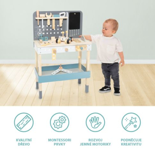 Prostorný ponk, který nesmí chybět v žádné dětské dílně. Ponk obsahuje velkou desku s cirkulárkou, na které jsou nejrůznější komponenty – od dřevěných destiček, přes šroubky až po matky. Pod deskou je úložný prostor. Součástí je také police s otvory za zavěšení dřevěného kladiva, metru a pilky. Ponk je vyrobený z kvalitního dřeva a barev na vodní bázi. Rozvíjí motoriku a fantazii.
