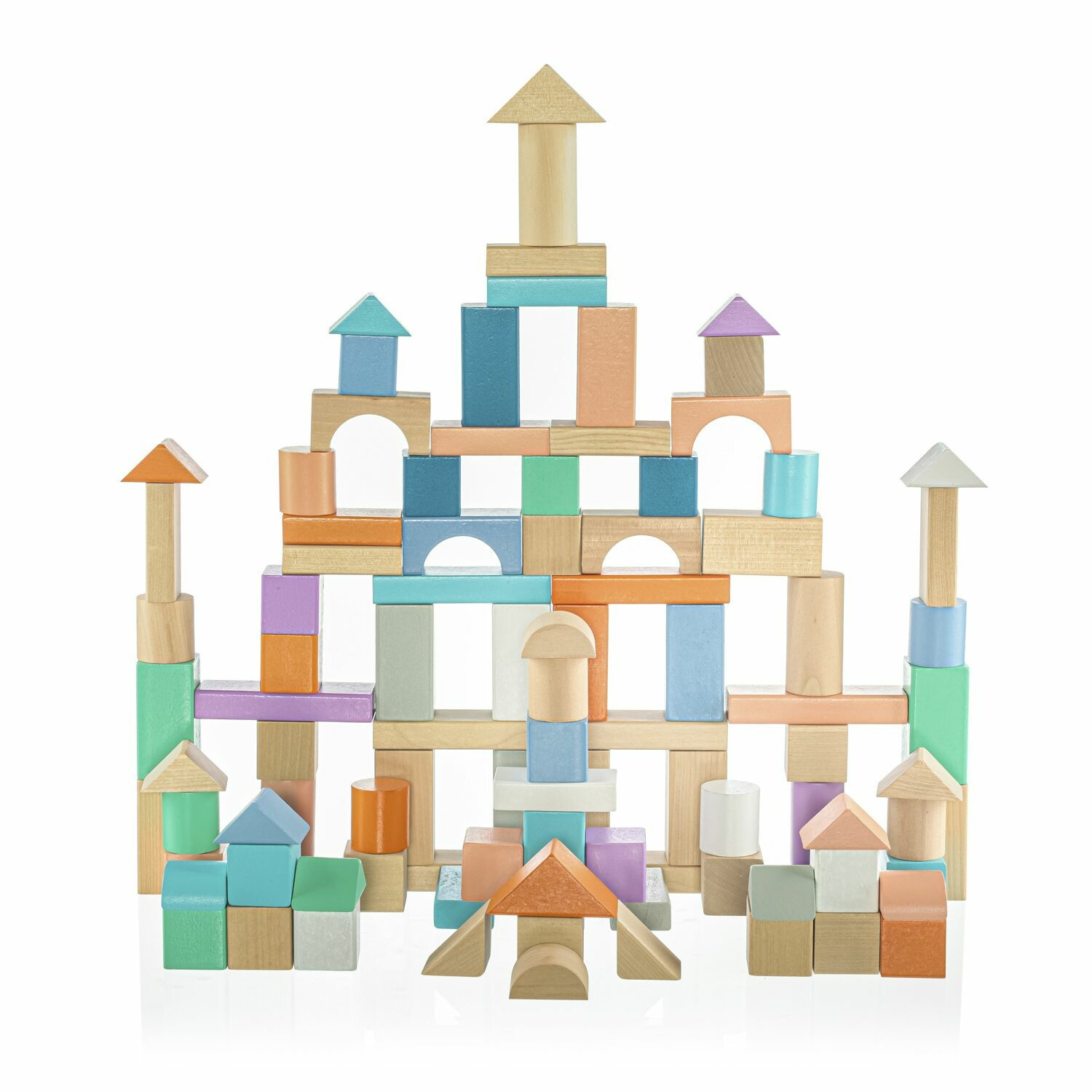 Kostky jsou vyrobeny z kvalitního dřeva a jsou dodávány s praktickým kyblíkem, který umožňuje snadné skladování a přenášení. Víčko kyblíku je navrženo tak, aby děti mohly trénovat rozpoznávání tvarů a zároveň se bavit při uklízení kostek. Praktické poutko pro snadné přenášení, zajistí, že kostky mohou být vzaty kamkoliv s sebou a děti si tak mohou hrát doma, na návštěvě nebo venku na dece.