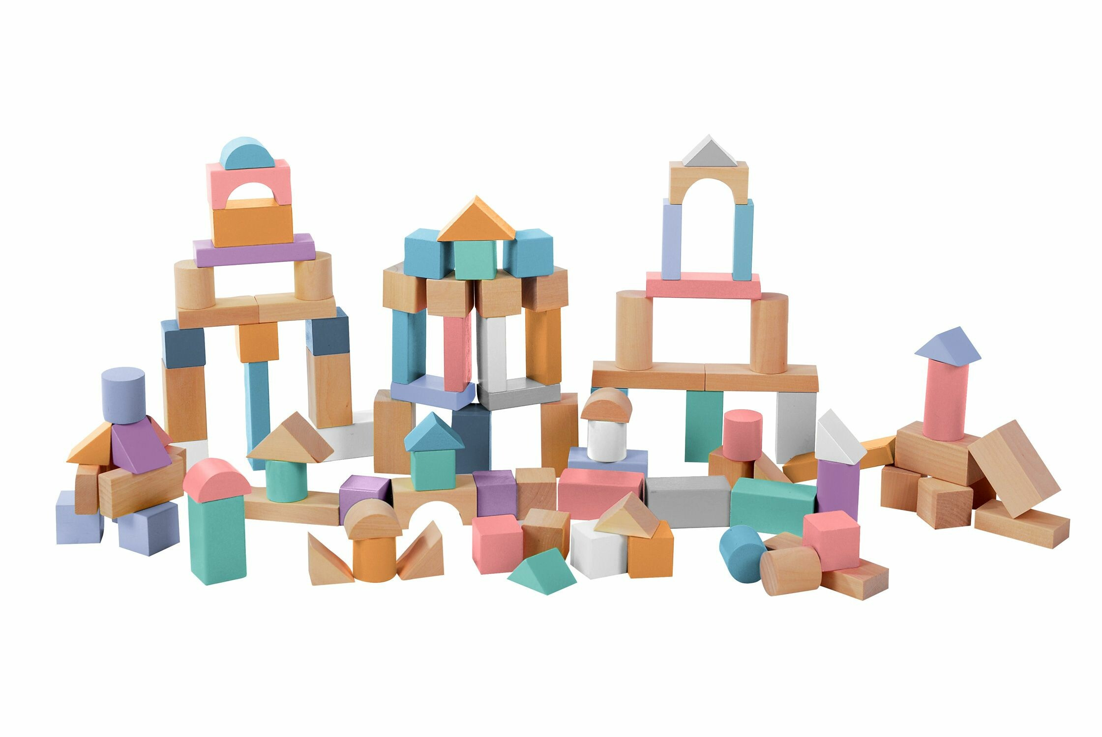 Spousta barev a tvarů, 100 ks, hodiny zábavy, podpora koordinace ruka-oko, rozvoj kreativity, prostorového a logického myšlení, kyblík pro skladování, poutko pro snadné přenášení, víčko pro trénink tvarů – to je Dřevěný set kostky 100 ks.