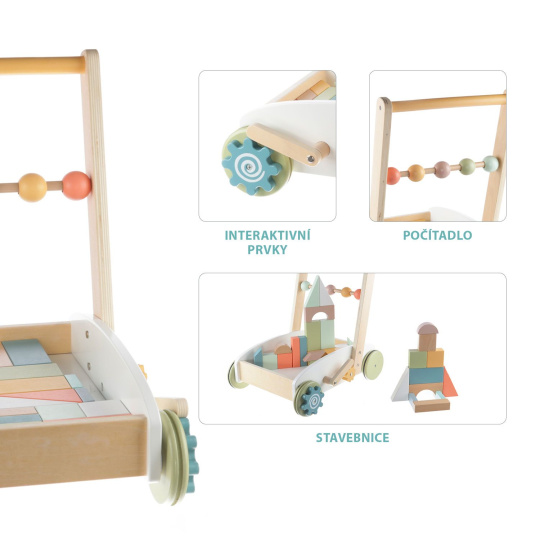 Fantazii se meze nekladou. Kompaktní vozík s dřevěnou rukojetí je plný různobarevných kostek, ze kterých může dítě postavit cokoliv. Pokud se z vozíku kostky vyndají, lze jej použít na převážení jiných hraček. Rukojeť je opatřena dřevěnými kuličkami, které lze přesunovat z jedné strany na druhou. Odolná kolečka zvládnou jakýkoliv typ podlahy. Hračka rozvíjí koordinaci, motoriku, prostorovou představivost a fantazii.