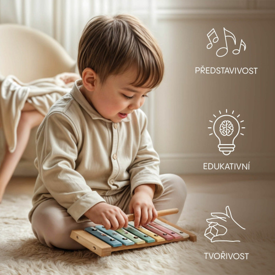 Hudba rozvíjí fantazii, kreativitu i motoriku – a přesně k tomu slouží krásný dřevěný xylofon ZOPA Deluxe, inspirovaný principy Montessori pedagogiky. Ideální pro děti od 12 měsíců, tento edukativní hudební nástroj podporuje samostatné objevování zvuků, rytmu i barev zcela přirozeným způsobem.