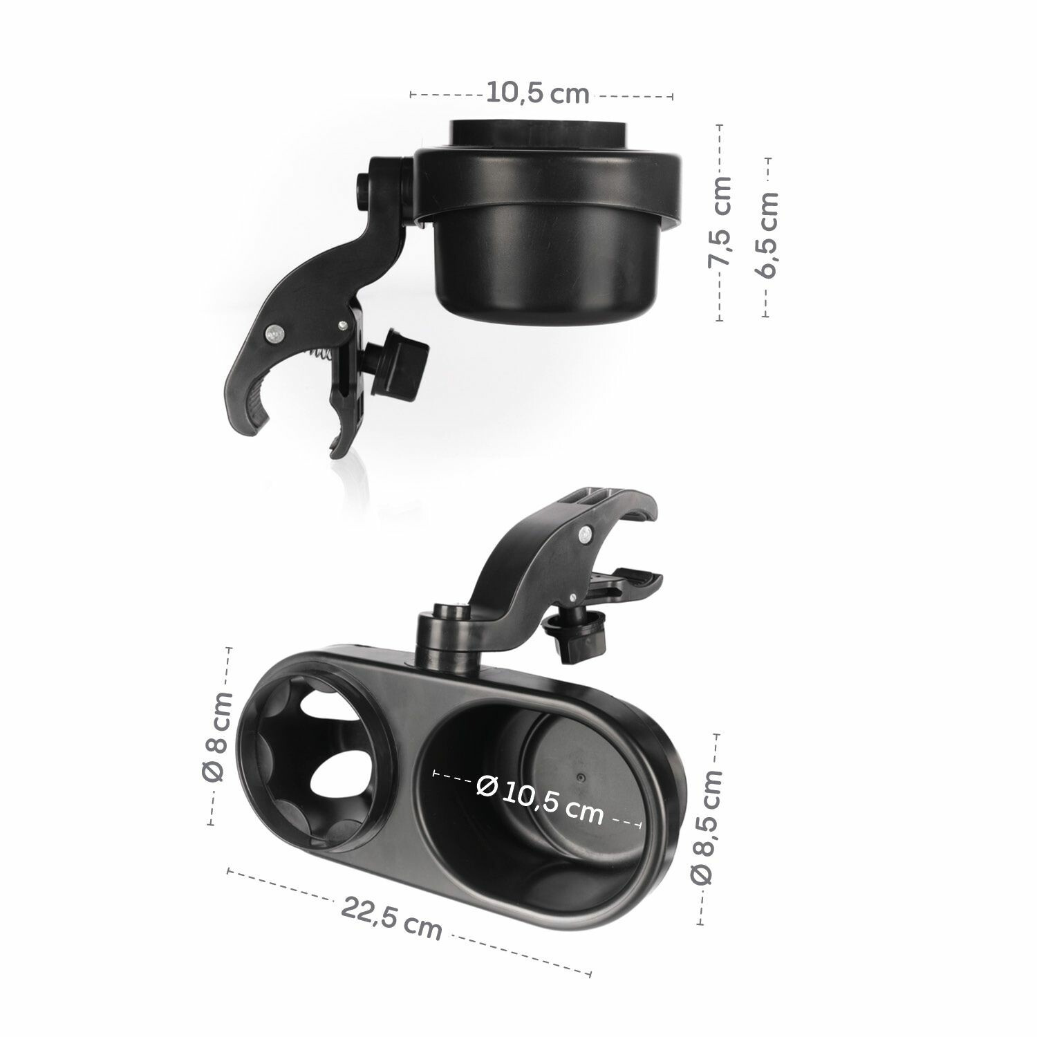 Nastavitelný úhel s kloubem otočným o 360 stupňů umožňuje snadné nastavení dle potřeby. Tento držák je praktický a všestranný pomocník, který usnadní vaše procházky a zajistí, že budete mít vždy vše potřebné po ruce.