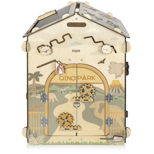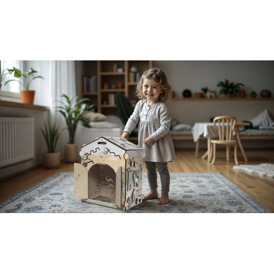 Na domečku najdete tkaničku, šněrování, zipy, ozubená kolečka, labyrinty, a dokonce i mechanický vypínač. Všechny tyto prvky pomáhají dětem stát se šikovnějšími a samostatnějšími. A přitom je to jen hra.