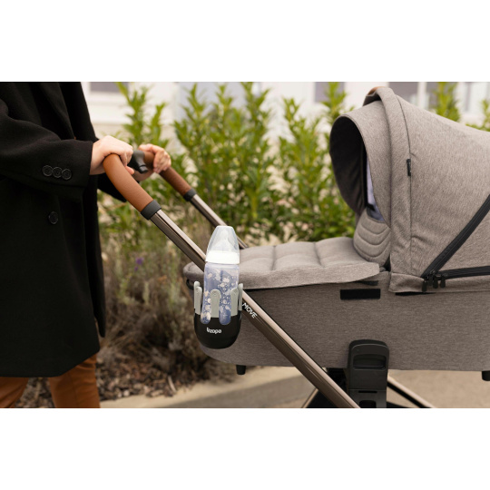 Flexibilní držák nápojů je navržený tak, aby se do něj vešly dětské láhve, kelímky s kávou i větší láhev s vodou až do průměru 8,5 cm. Systém s 360° rotací lze díky jednoduché instalaci pomocí suchého zipu připevnit na rukojeť téměř jakéhokoliv kočárku. Unikátní, moderně vypadající pětiprstý systém zajišťuje lepší stabilitu kelímku nebo láhve, zabraňuje tak nechtěnému vylití nápoje.