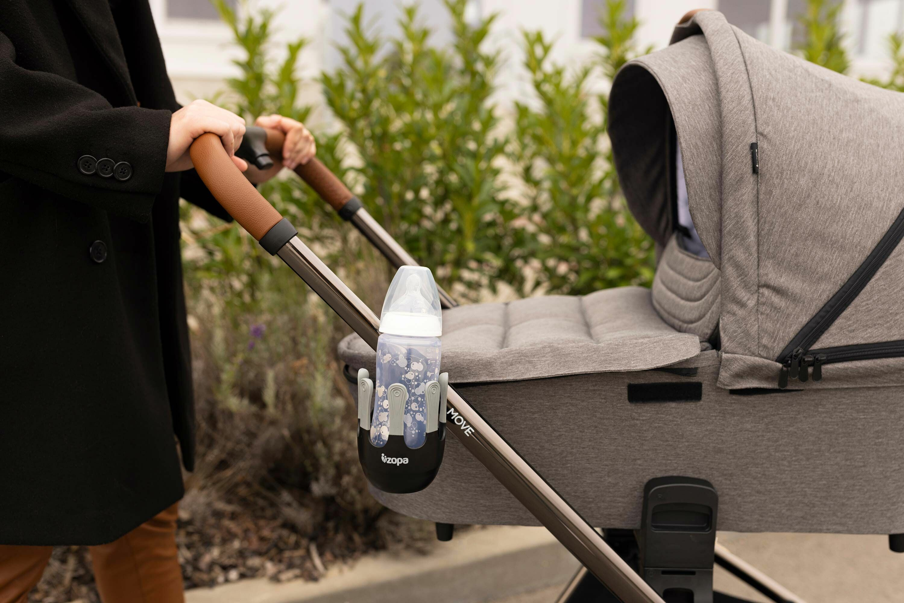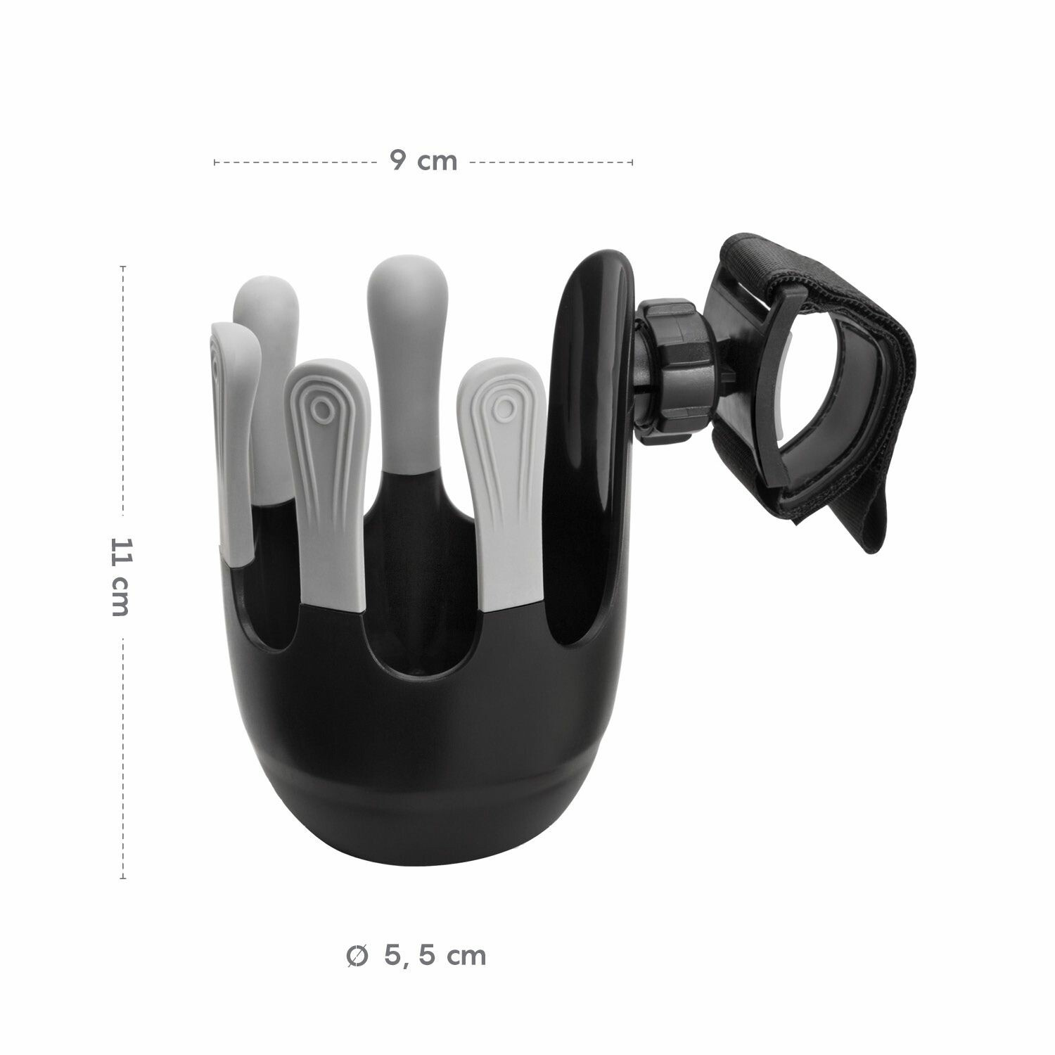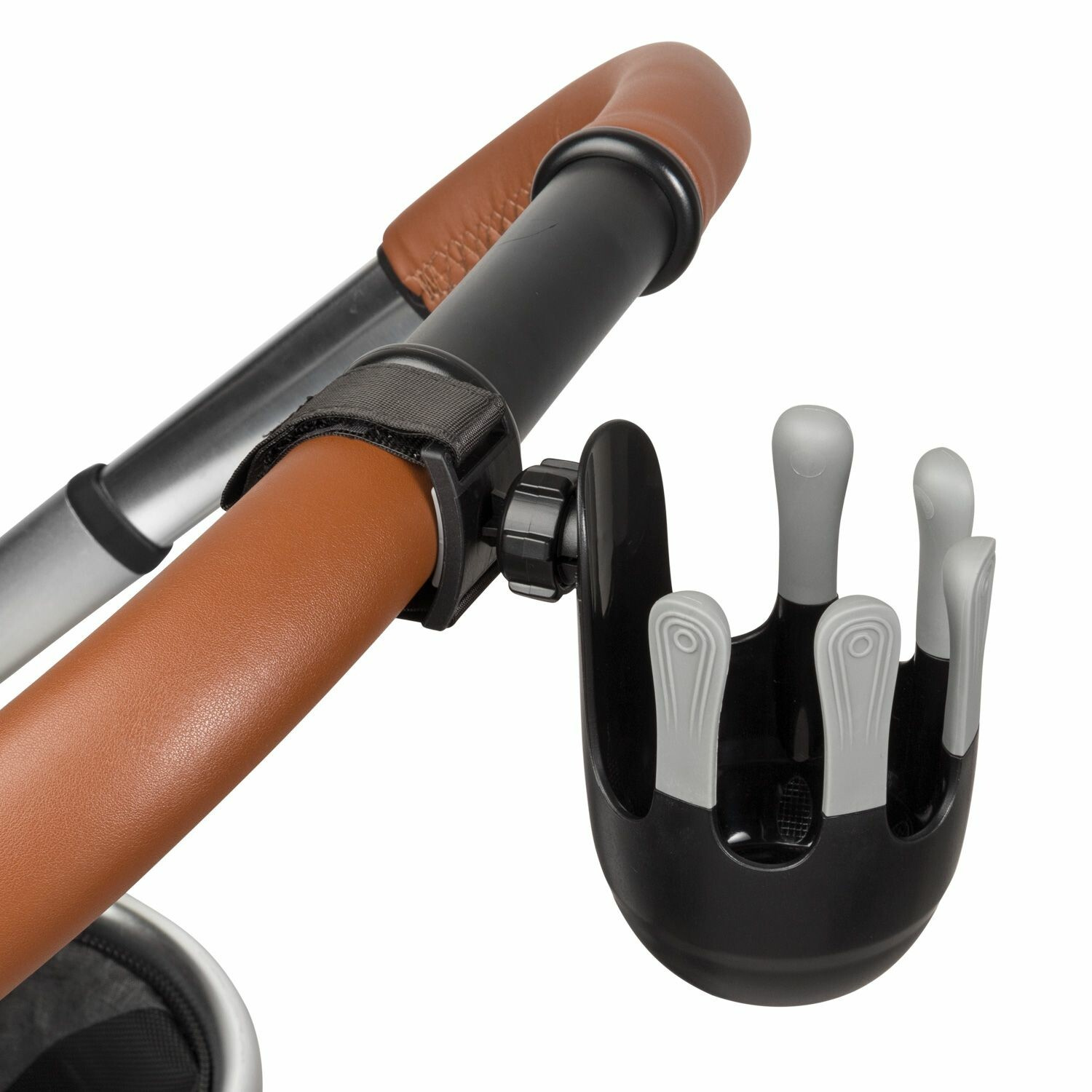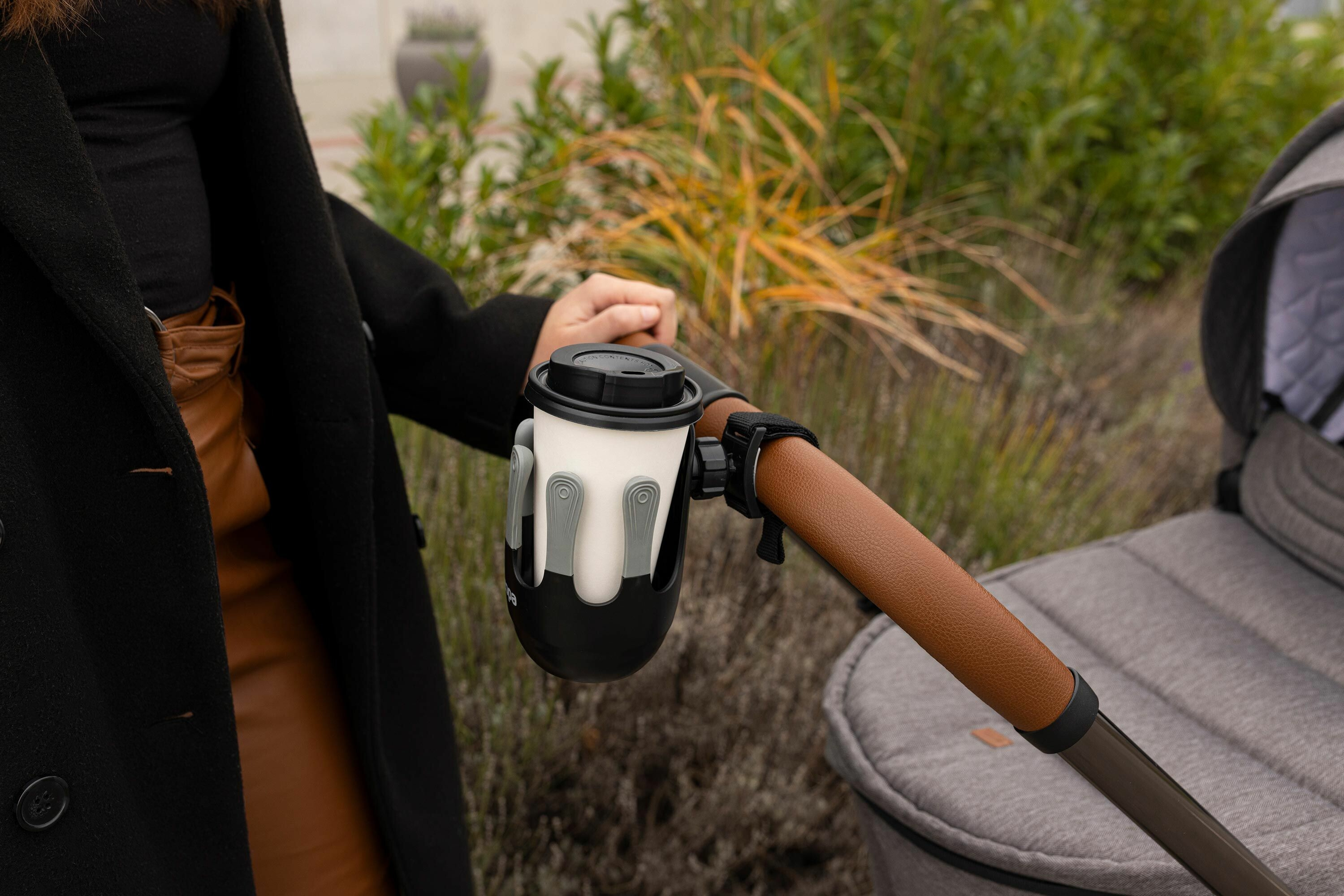 Flexibilní držák nápojů je navržený tak, aby se do něj vešly dětské láhve, kelímky s kávou i větší láhev s vodou až do průměru 8,5 cm. Systém s 360° rotací lze díky jednoduché instalaci pomocí suchého zipu připevnit na rukojeť téměř jakéhokoliv kočárku. Unikátní, moderně vypadající pětiprstý systém zajišťuje lepší stabilitu kelímku nebo láhve, zabraňuje tak nechtěnému vylití nápoje.