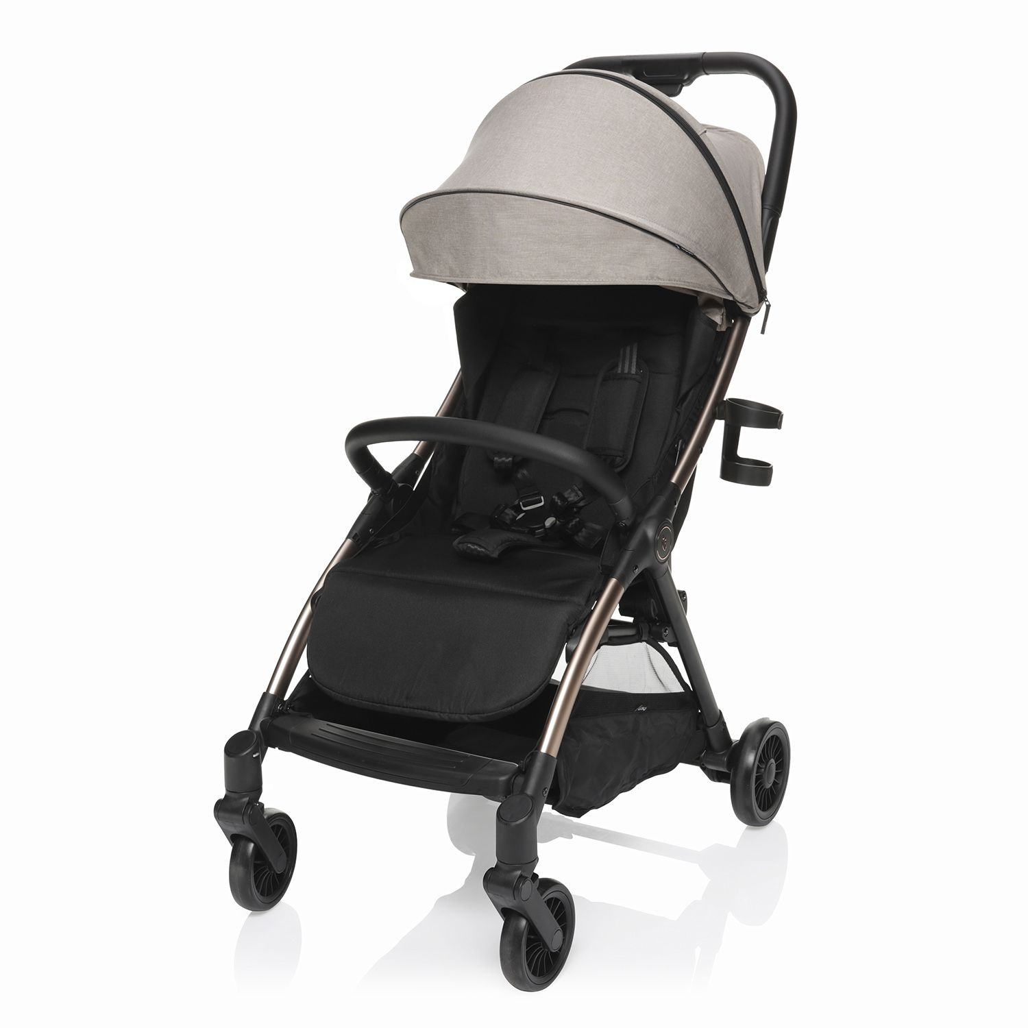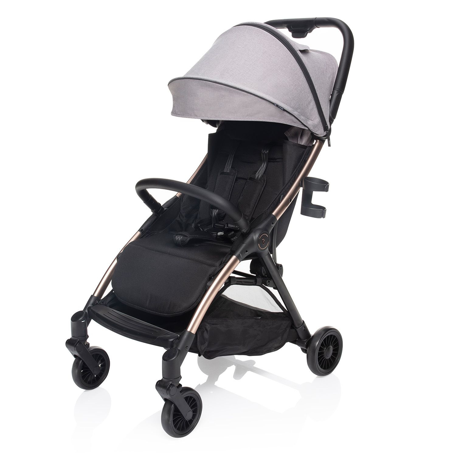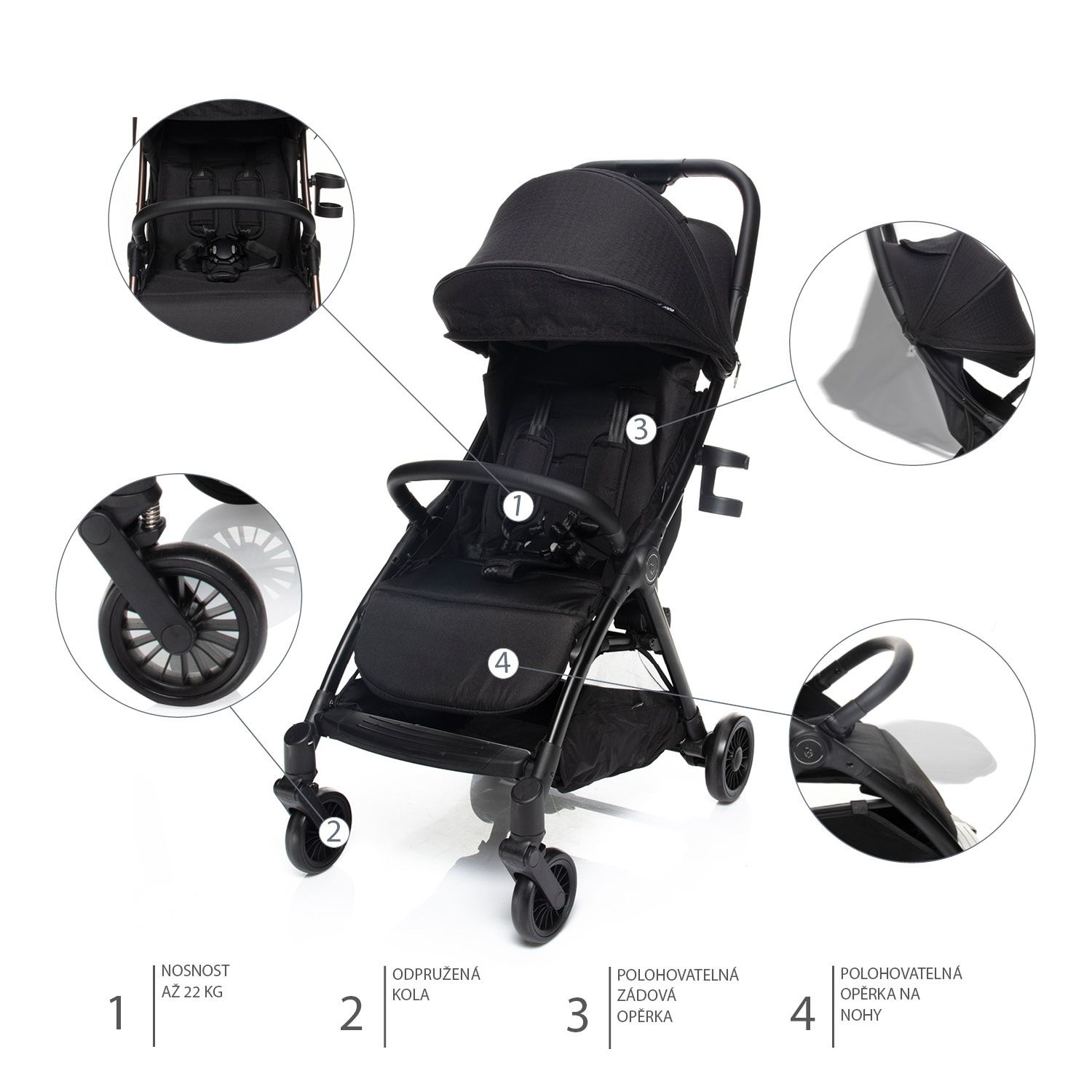 Lehká konstrukce, polohovatelná zádová opěrka, polohovatelná opěrka na nožičky, prodloužitelná stříška s okýnkem, 5bodový pás s magnetickou sponou, nášlapná brzda, odpružená kola, odklápěcí hrazda, složení jednou rukou – to je kočárek Quiq.