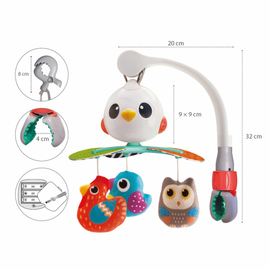 Točící se hračka nabízí nejen vizuální stimulaci, ale i možnost použití jako samostatnou rotující hračku. S třemi způsoby uchycení na autosedačku, postýlku nebo kočárek, bude vaše dítě vždy obklopeno zábavou.