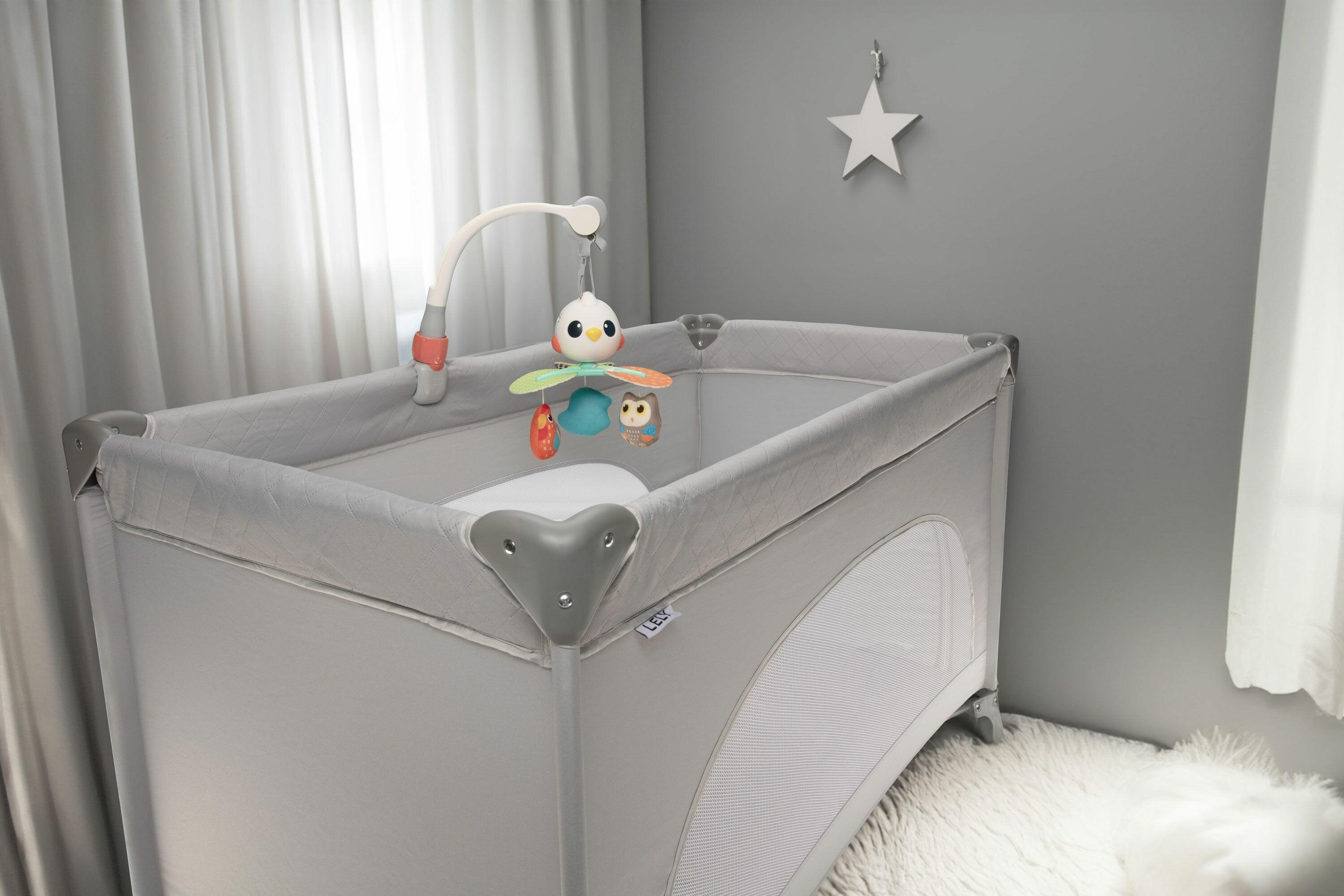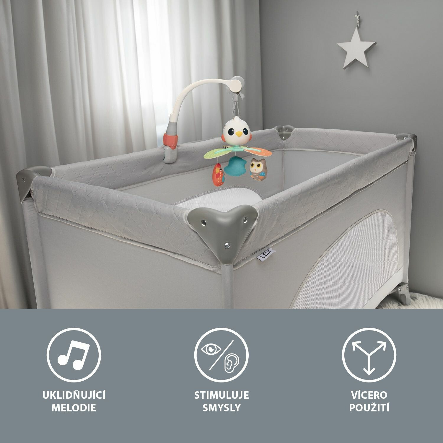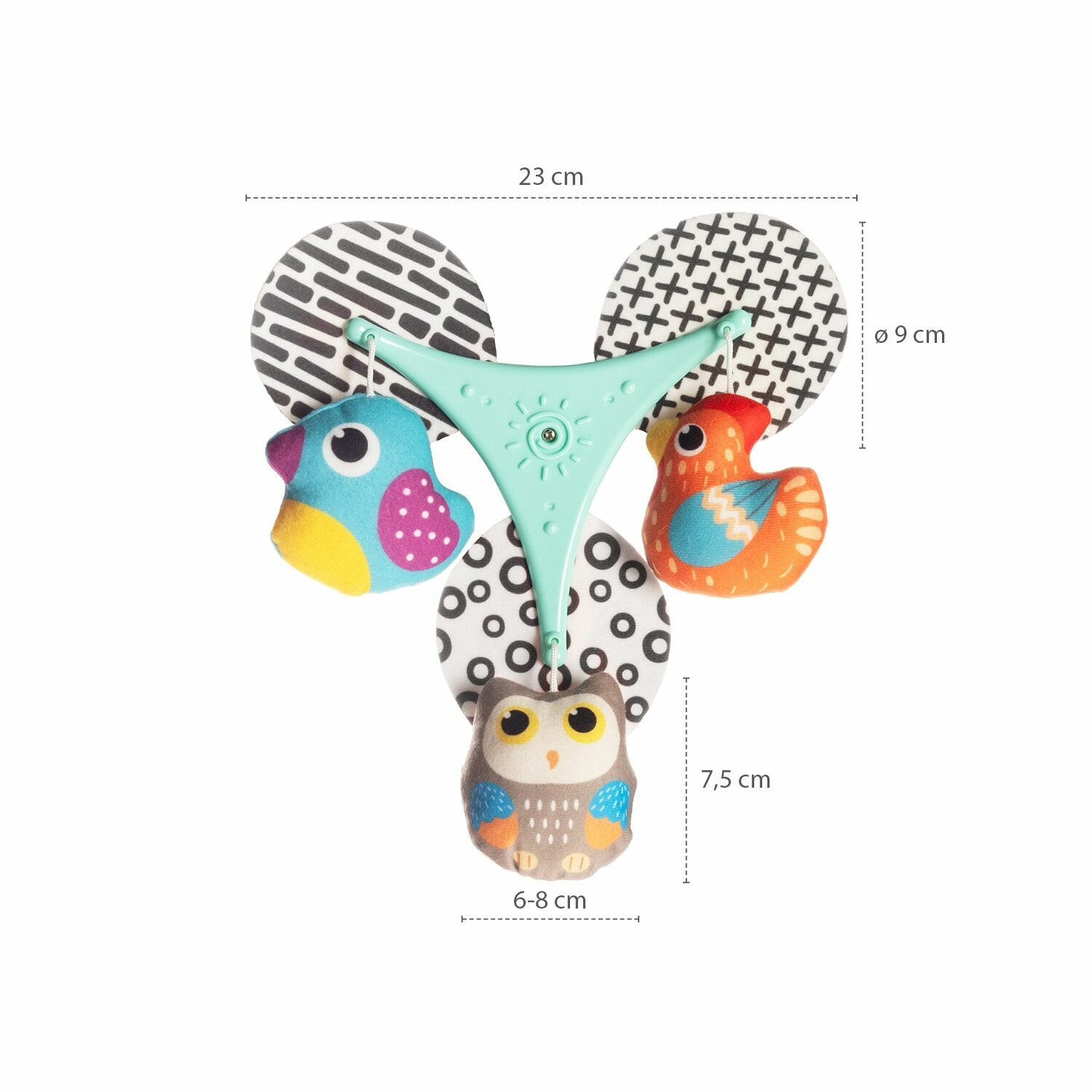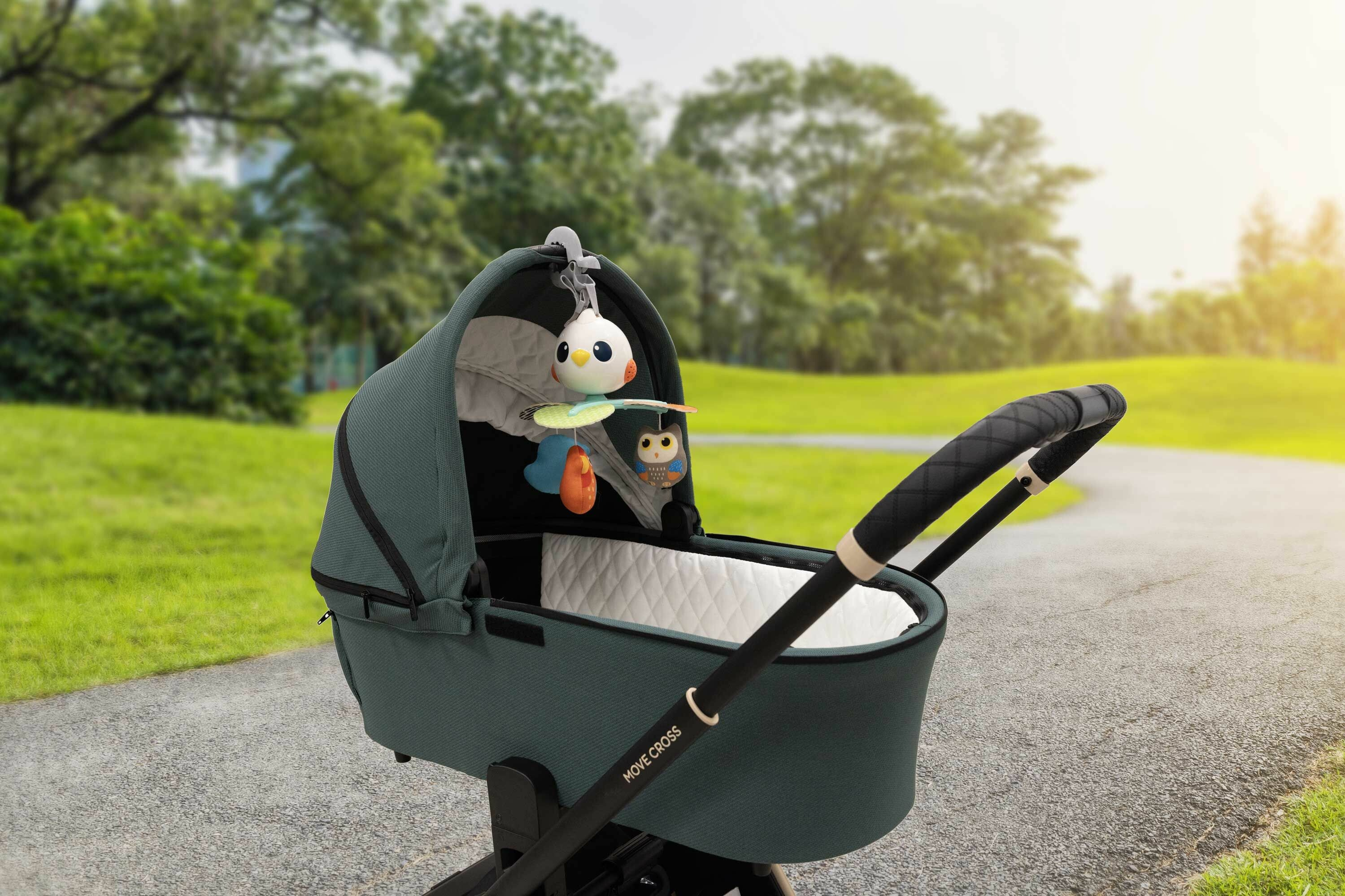 Točící se hračka nabízí nejen vizuální stimulaci, ale i možnost použití jako samostatnou rotující hračku. S třemi způsoby uchycení na autosedačku, postýlku nebo kočárek, bude vaše dítě vždy obklopeno zábavou.
