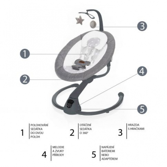 Unikátní konstrukce lehačky umožňuje otáčení o 360° a polohování sedátka do 2 poloh. Funkce houpání do stran připomíná pohyb kolébky, houpání dopředu/dozadu nahrazuje houpání v náručí. Lehačka disponuje 5 stupni intenzity houpání a automatickým zapnutím houpání při detekci pohybu dítěte. Samostatně lze také nastavit dobu houpání na 8, 15 či 30 minut.