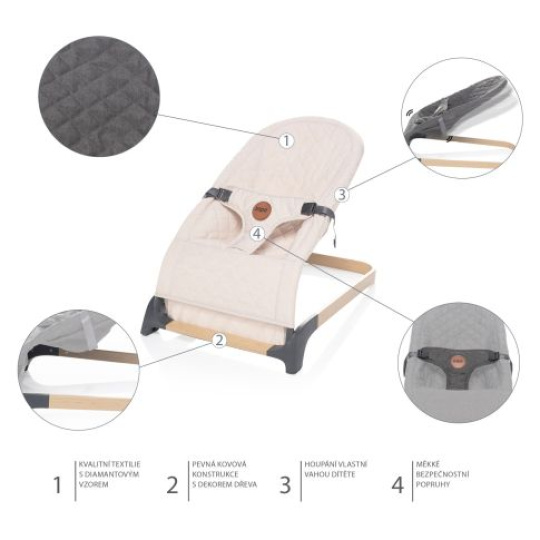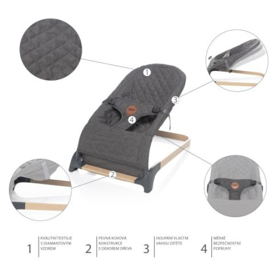 Díky pevné a zároveň pružné kovové konstrukci lehačka umožňuje houpání na základě vlastní váhy dítěte nebo dítě mohou houpat rodiče. Houpání je tak zcela přirozené. Miminko se rychle naučí, jak se v lehátku rozhoupat a rozvíjí tak motorické dovednosti a rovnováhu.
