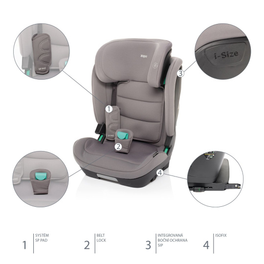 Polohování do 4 pozic, výškově nastavitelná opěrka hlavy, SIP ochrana bočního nárazu, bezpečnostní vycpávky SP PAD,