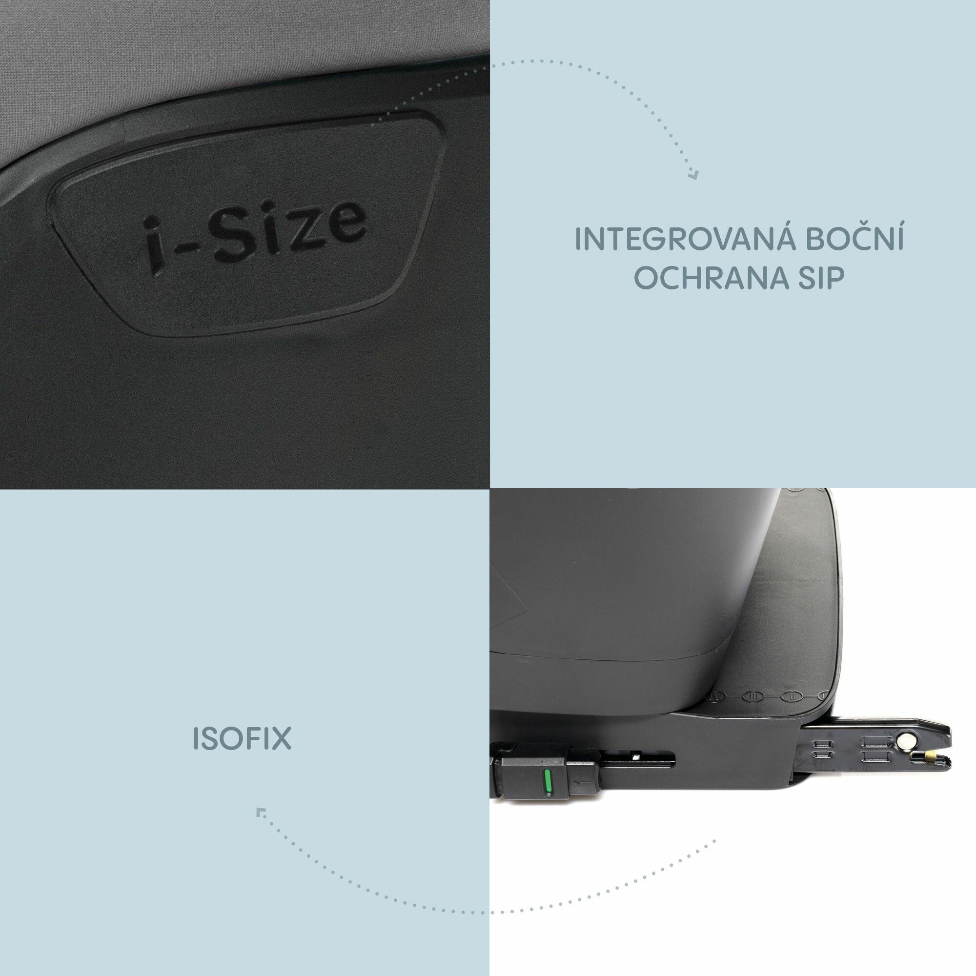 Integrovaná boční ochrana SIP po celé délce chrání dítě i ve spodní části. Splnění nejnovější normy i-SIZE garantuje bezpečí po celou dobu používání.
