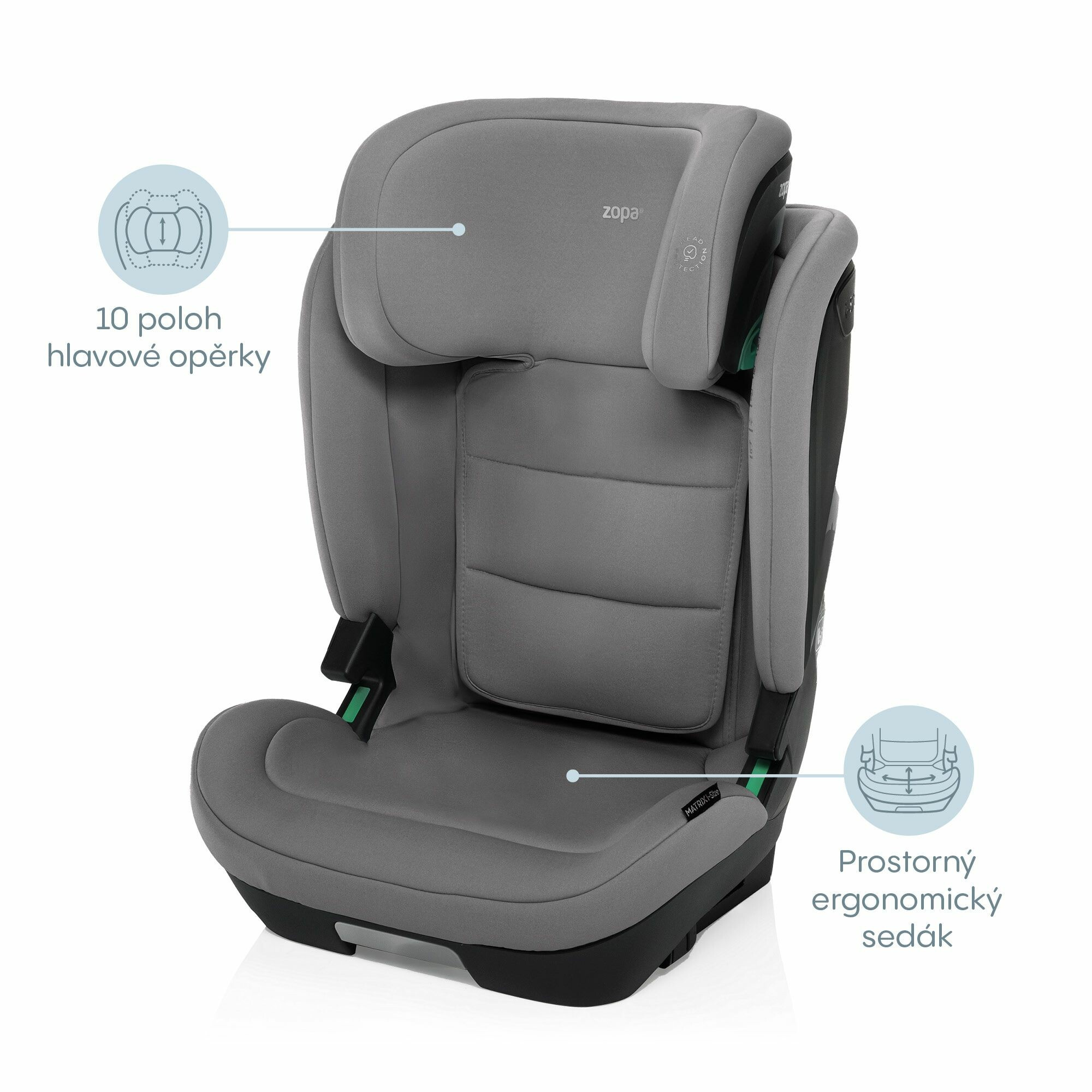 Polohování do 4 pozic, výškově nastavitelná opěrka hlavy, SIP ochrana bočního nárazu,