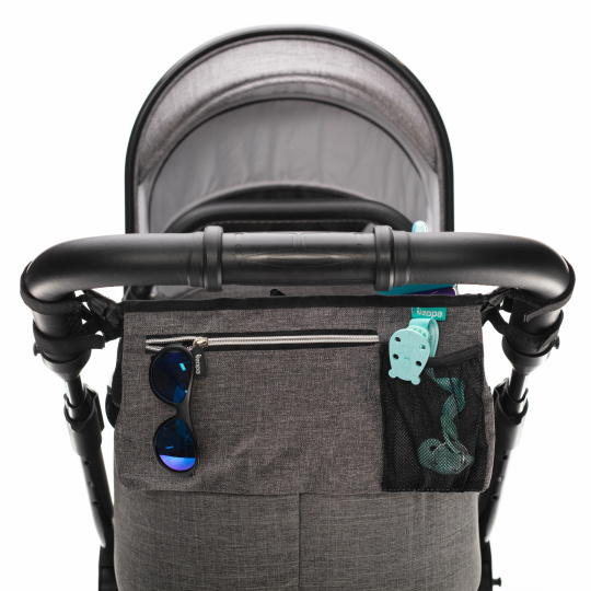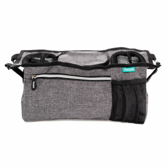Praktický a přehledný organizér na kočárek je ideální na procházky s děťátkem. Přední část organizéru obsahuje velkou kapsu na zip na drobnosti, které by maminka během vycházky mohla potřebovat. Rovněž je přední strana opatřena kapsičkou na mobilní telefon ze síťoviny, takže má maminka vždy přehled, když se něco s telefonem děje navzdory tichému režimu. Děťátko tak nic nevzbudí. Ve střední části se nachází velká kapsa na zip na uložení potřebných věcí. Na bočních stranách má dva držáky na nápoje.