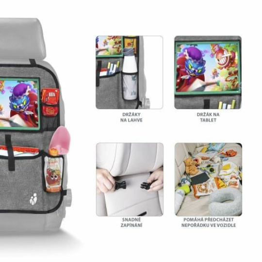 Praktický organizér na sedadlo s kapsou na tablet je perfektní společník na každou cestu s dětmi. Kapsa na tablet chrání jeho dotykovou obrazovku a umožňuje k tabletu rychlý přístup. Průhlednost kapsy zajišťuje jeho perfektní obraz. Organizér kromě toho obsahuje dva držáky na láhve s pitím. Svou univerzálností připevnění na sedadlo je kompatibilní téměř s každým vozidlem. Připevnit lze pomocí praktických spon s nastavitelnou délkou, což pomáhá regulovat jeho umístění. Kromě toho obsahuje další kapsu na ukládání drobností na cesty a dvě kapsy ze síťoviny na mobil nebo jiné maličkosti.