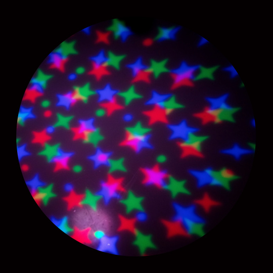 Projektor a hudba fungují po vložení baterek a mají automatické vypínání.