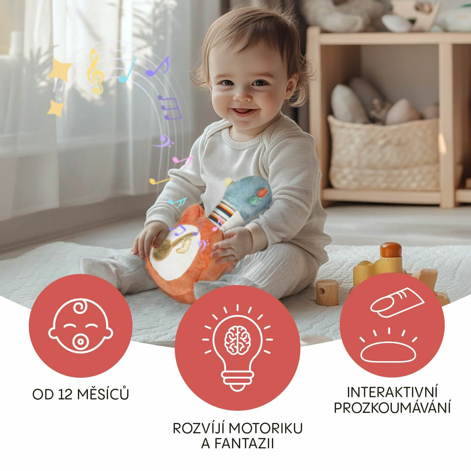 Podporuje rytmus, motoriku a kreativitu. Vhodné pro děti od 12 měsíců.