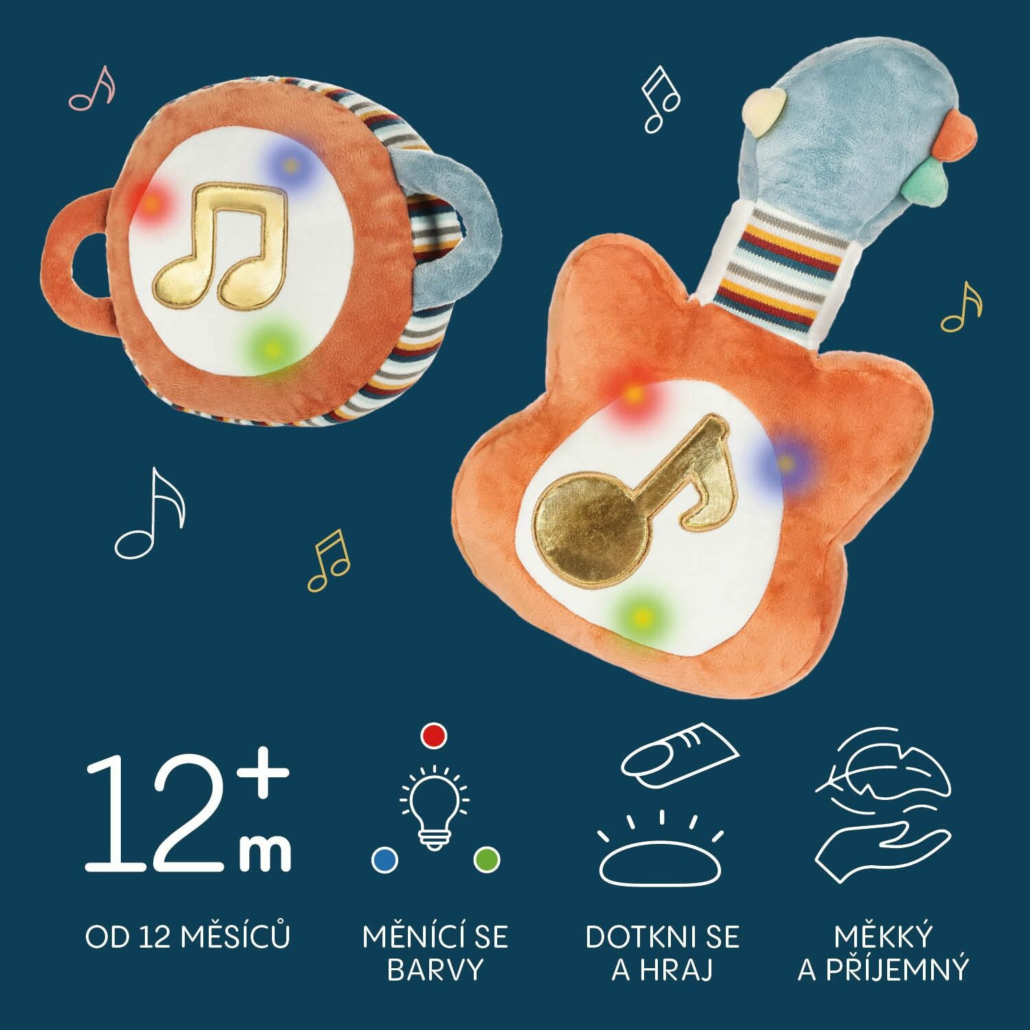 Interaktivní plyšový hudební nástroj s veselými melodiemi, světelnými efekty a dotykovým ovládáním.