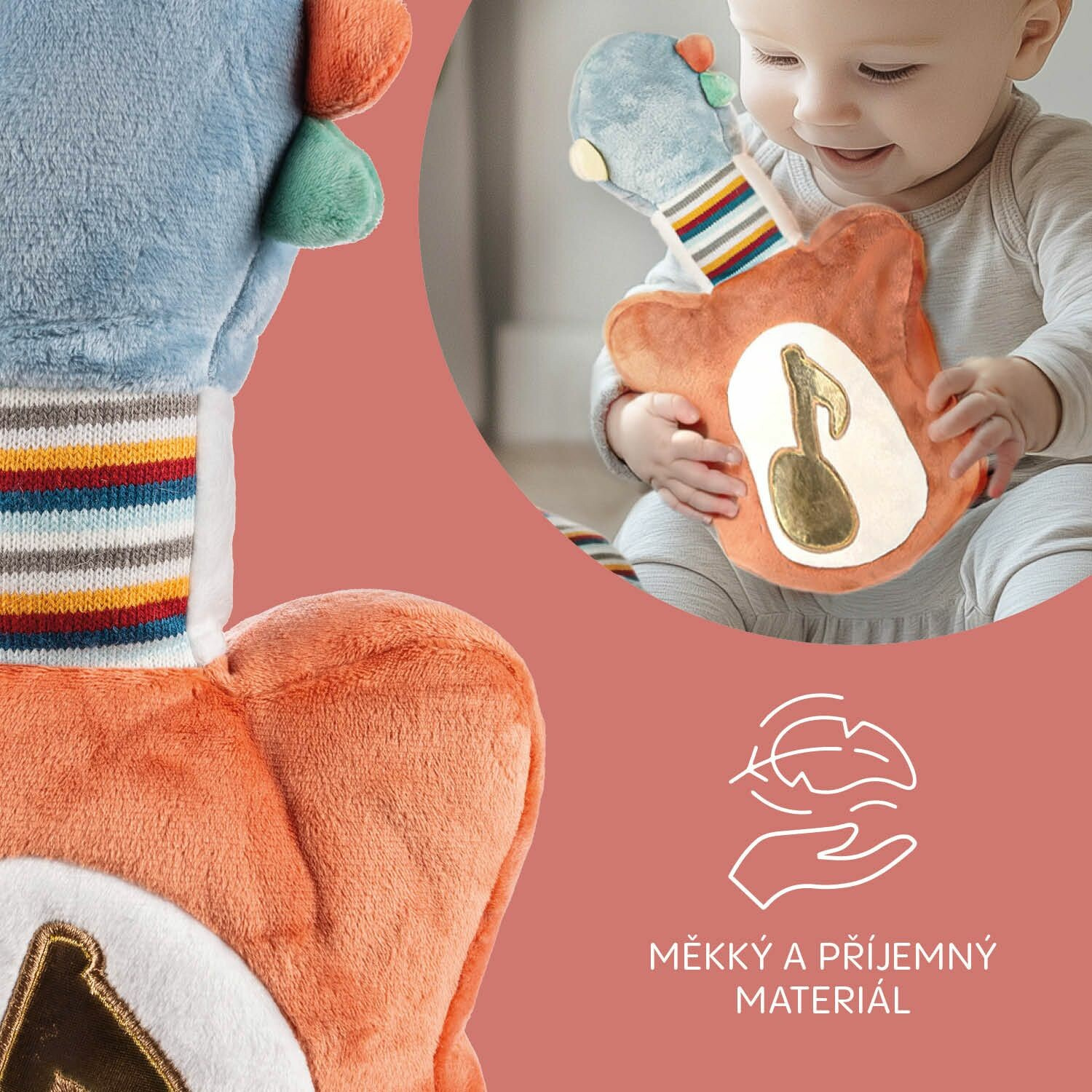 Plyšový materiál je nejen hebký na dotek, ale i bezpečný pro nejmenší. Díky snadnému ovládání dotykem je hračka ideální už pro děti od 12 měsíců.