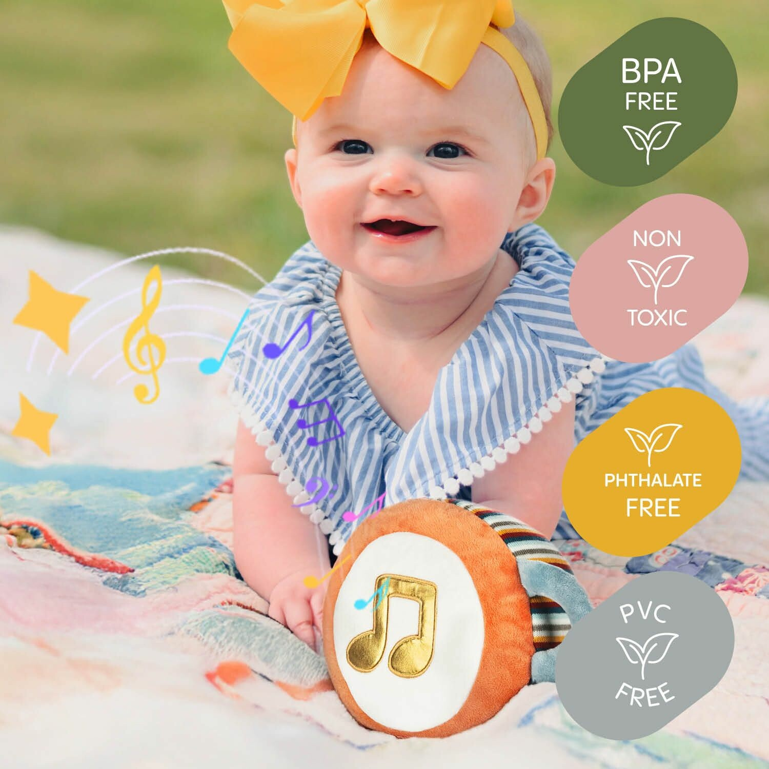 Objevte kouzlo hudby a rytmu s tímto interaktivním plyšovým nástrojem! Stačí lehké poklepání a rozezní se 16 veselých melodií. A to je teprve začátek! V interaktivním režimu se z vašeho drobečka stává malý skladatel. Poklepáváním během přehrávání melodií se zapojí bubnování, které se přizpůsobí tempu doteků. Tento hravý prvek přirozeně rozvíjí cit pro rytmus a zdokonaluje motorické dovednosti.