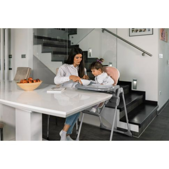 Židlička, která se plně přizpůsobí potřebám rodičů i dětí. Pevná stabilní konstrukce je velmi lehká a dá se snadno složit pomocí dvou pojistek po stranách. Ve složeném stavu sama stojí na místě. Díky kompaktním rozměrům lze složenou židličku umístit i do malých prostorů. Po složení má šířku pouhých 13 cm.