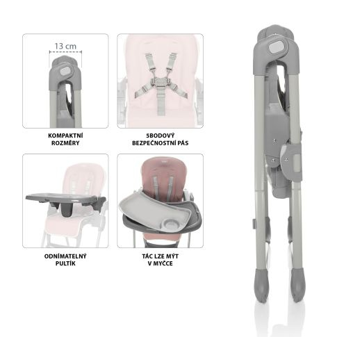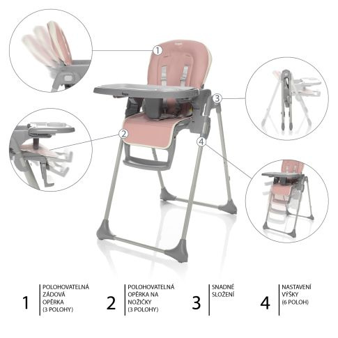 Židličku lze snadno nastavit tak, aby sezení v ní bylo co nejpohodlnější. Nastavitelnou zádovou opěrku lze polohovat do 3 pozic. Samozřejmostí je nastavení výšky do 6 různých poloh. Nastavit je možné i opěrku pro nožičky. Do odnímatelného pultíku je vsazen tác, který lze samostatně vytáhnout. Potah židličky je omyvatelný a případě ušpinění jej stačí otřít vlhkým hadříkem. Pro co největší bezpečí dítěte je židlička vybavena 5bodovým bezpečnostním pásem.