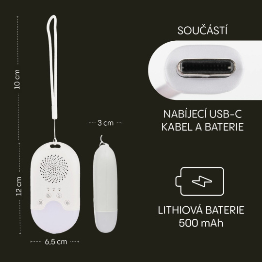 Přenosný usínací modul s LED světlem, bílým šumem a zvuky je ideálním pomocníkem pro klidný spánek vašeho dítěte, a to jak doma, tak na cestách.