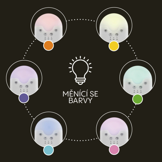 Modul je vybaven stmívatelným bílým světlem, které snadno přizpůsobíte aktuálním potřebám. Pro hravější atmosféru nabízí měnící se RGB barvy, které lze zastavit na oblíbené barvě. Kromě toho modul přehrává až 8 uklidňujících zvuků a melodií, včetně oblíbeného bílého šumu, který pomáhá dítěti rychleji se uklidnit a usnout.