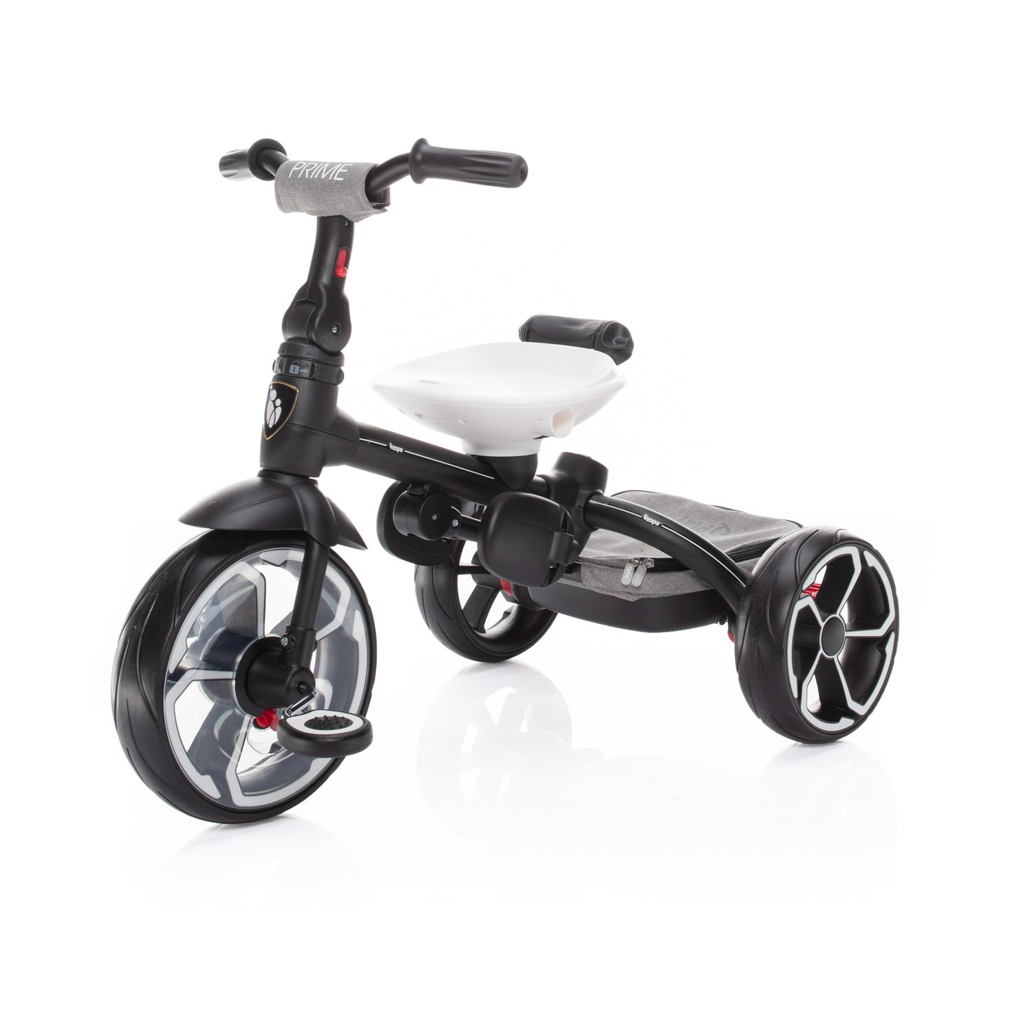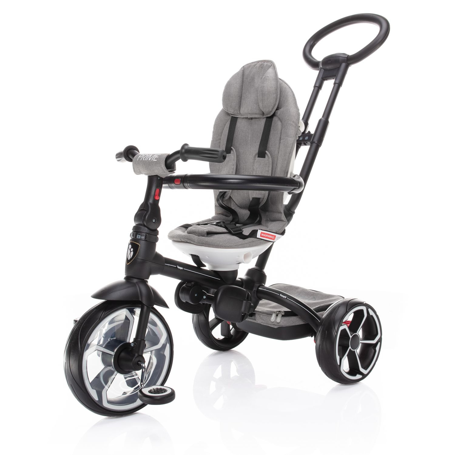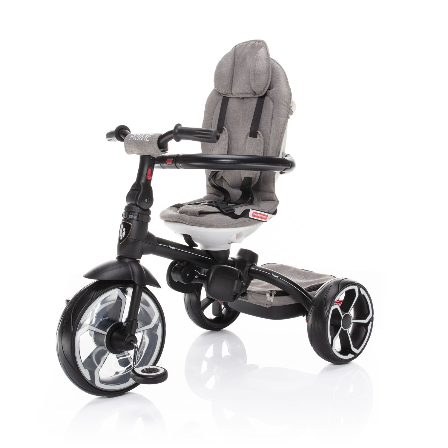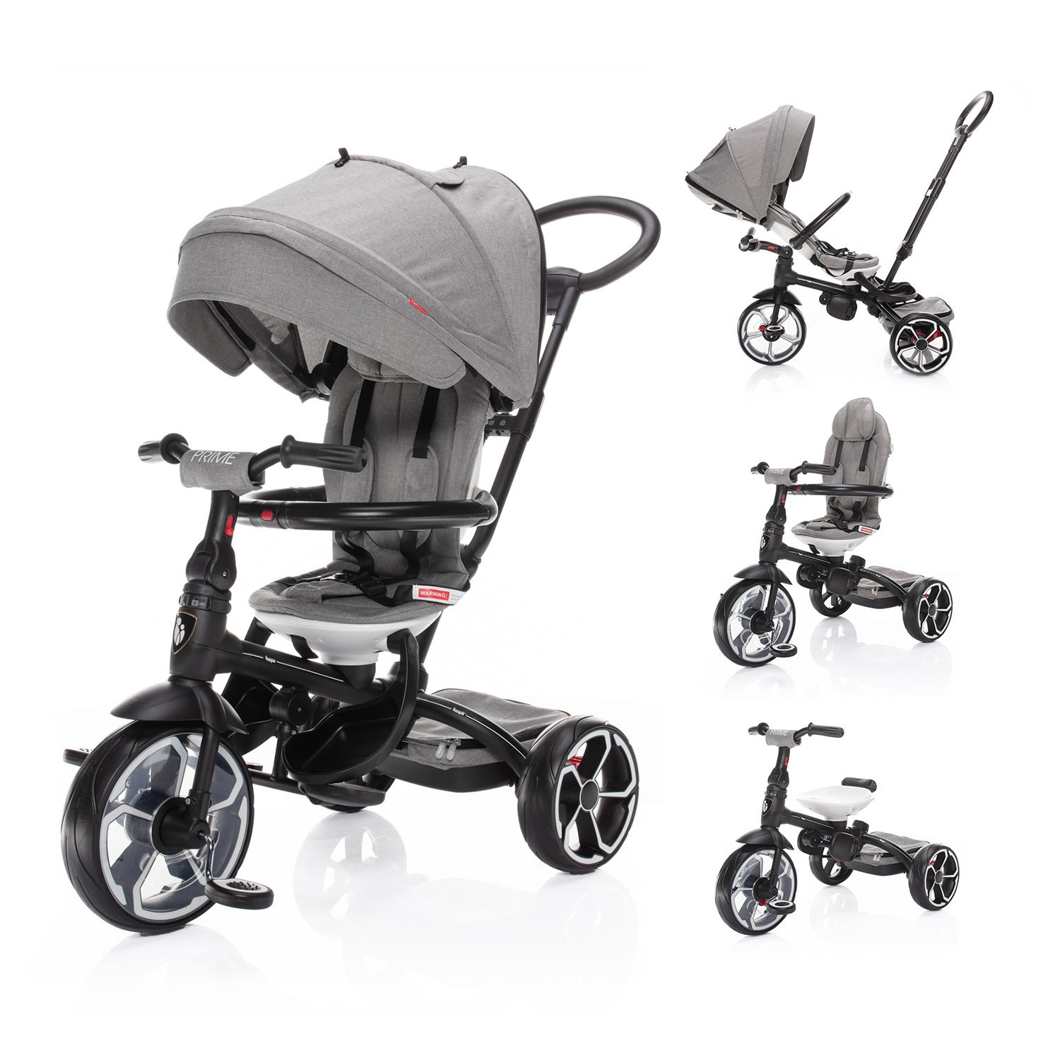 S tím, jak dítě roste a vaše potřeby se mění, tříkolka Prime nabízí možnost 4 režimů použití. V 1. režimu je dítě posazené směrem k rodiči, pedály a řídítka jsou odpojené. Ve 2. režimu je dítě naopak směrem od rodiče, přičemž pedály a řídítka jsou stále odpojené. 3. režim nabízí to, že dítě sedí směrem od rodiče, pedály a řídítka jsou zapojené s možností aktivního pohybu dítěte. A v posledním, 4. režimu sedí dítě obráceně, směrem od rodiče, pedály a řídítka jsou zapojené. Rodič už tříkolku neřídí, vodící tyč je sejmutá a dítě jede zcela samo.