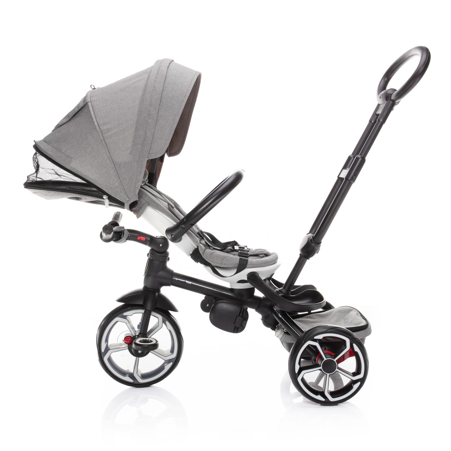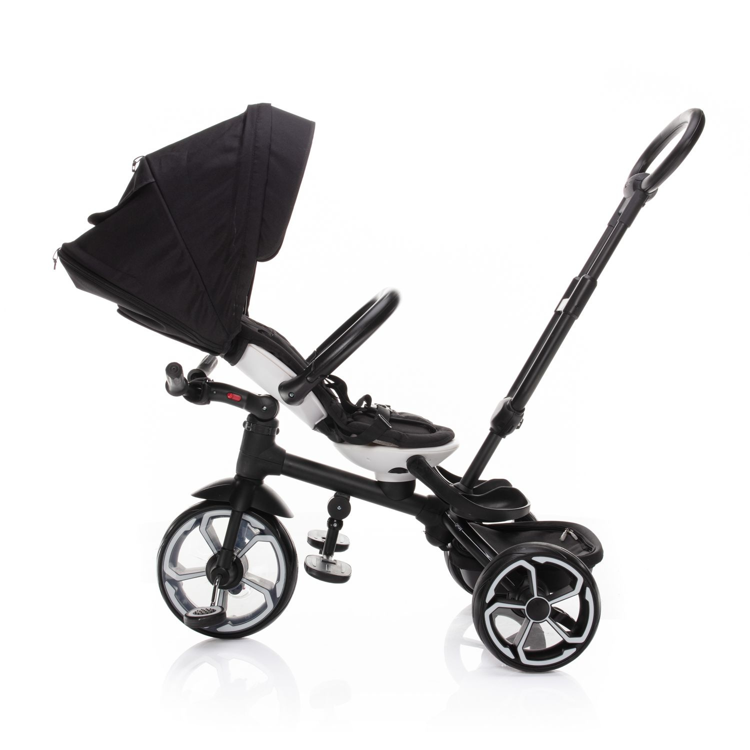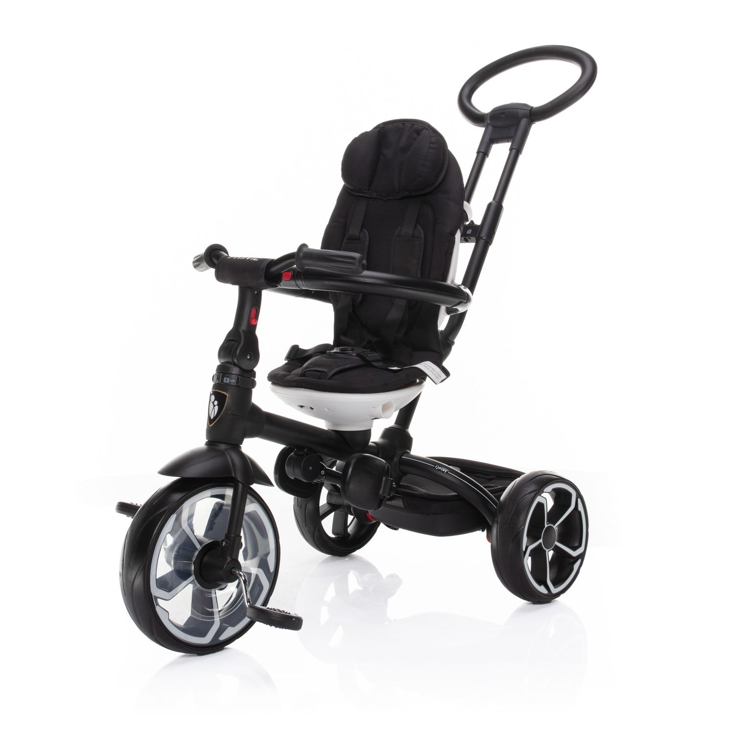 Při vývoji tohoto nepřehlédnutelného dopravního prostředku jsme nemysleli samozřejmě jen na pohodlí malého pasažéra, ale i na vás, rodiče. Rukojeť tříkolky je proto nastavitelná tak, aby se mohla přizpůsobit vaší výšce. Lehce odpojitelná šlapátka a řídítka přitom zajistí pasivní pozici dítěte a tříkolku řídíte jen vy.