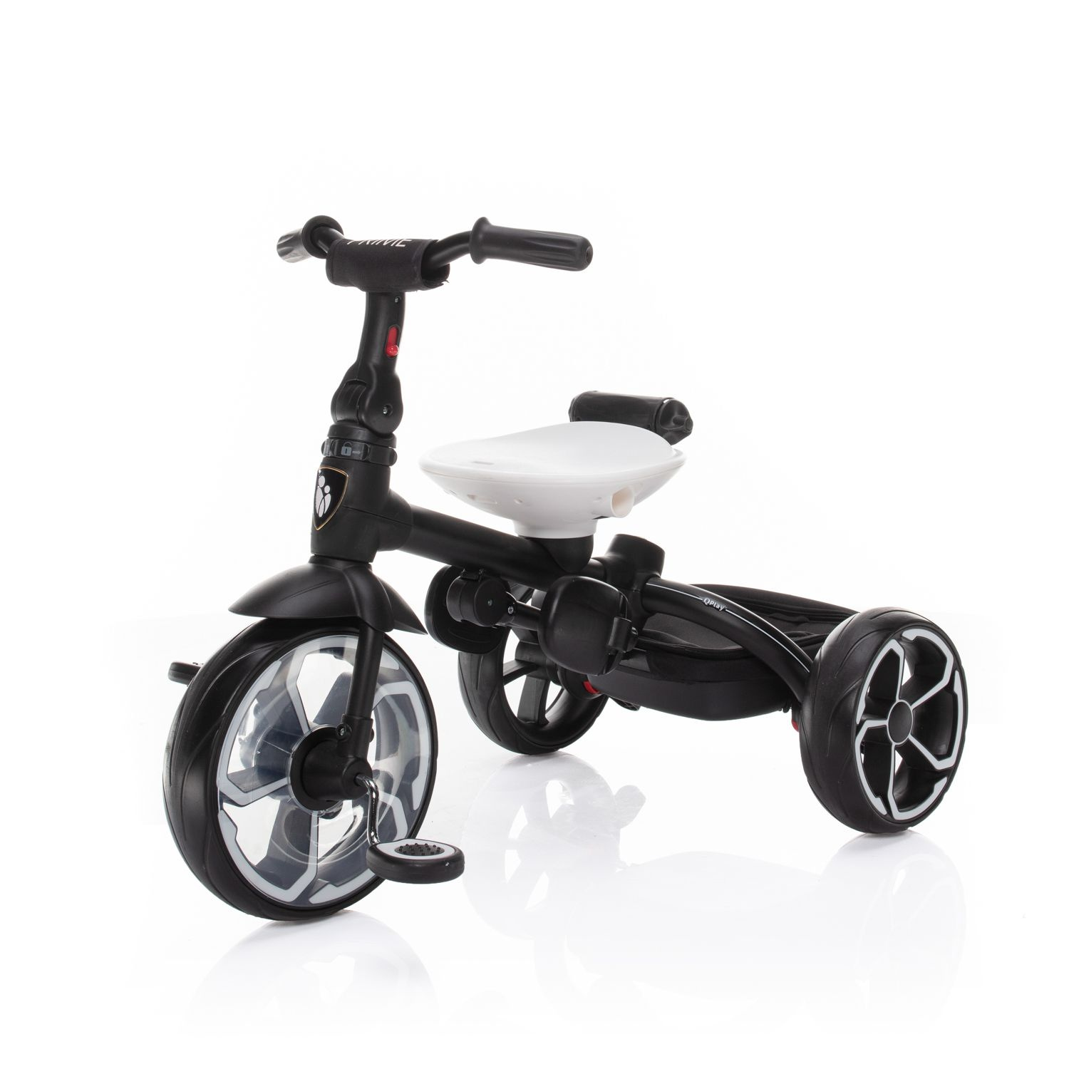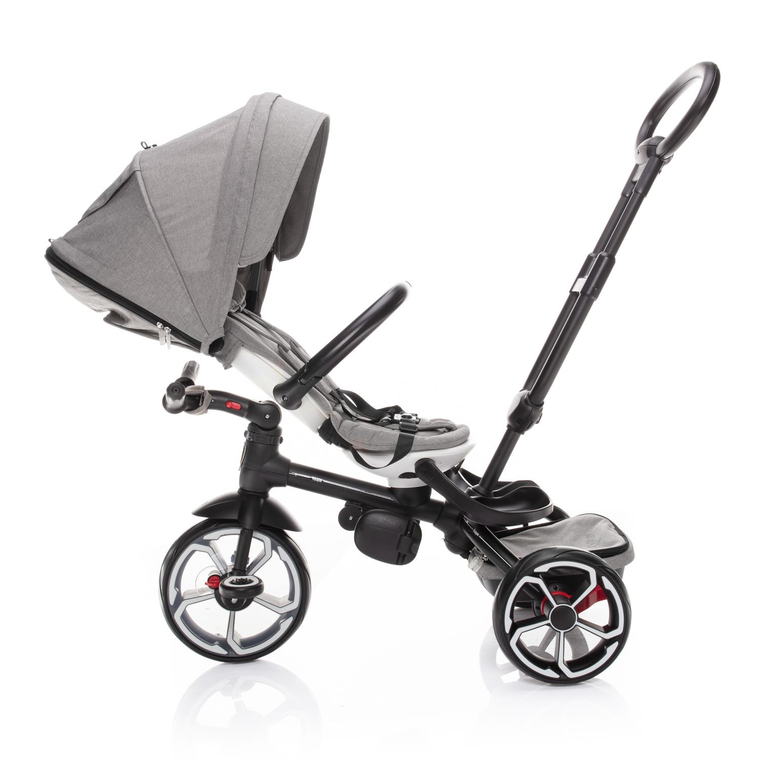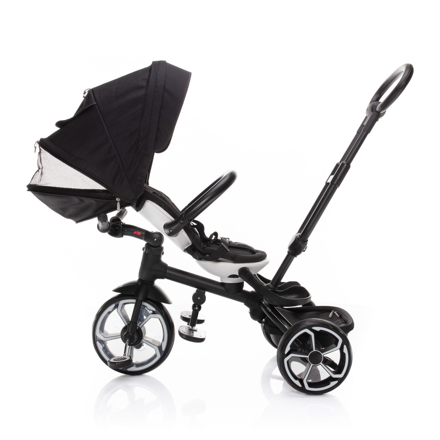 Při vývoji tohoto nepřehlédnutelného dopravního prostředku jsme nemysleli samozřejmě jen na pohodlí malého pasažéra, ale i na vás, rodiče. Rukojeť tříkolky je proto nastavitelná tak, aby se mohla přizpůsobit vaší výšce. Lehce odpojitelná šlapátka a řídítka přitom zajistí pasivní pozici dítěte a tříkolku řídíte jen vy.