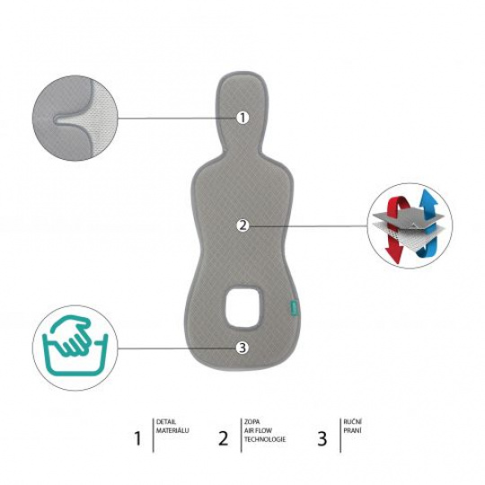 Prodyšnost zajišťuje unikátní technologie Zopa Air Flow, látka s 3D hexagon strukturou dovolující proudění vzduchu skrz vložku, mezi autosedačkou a dítětem.