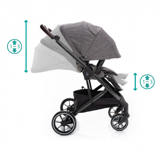 Další novinkou u kočárku QUEST je, že si přes pojistku můžete jednoduše nastavit výšku rukojeti. Pohodlnou a ničím nerušenou jízdu i ve složitějším terénu vám zaručí odpružení všech 4 gumových kol v novém designu. Ta jsou stejně měkká jako nafukovací, ale jsou navíc bezúdržbová. Tudíž nehrozí jejich propíchnutí. Pohodlná jízda u kočárku QUEST je zajištěna nejen kvalitním odpružením, ale i dostatečnou velikostí kol. Proto kočárek disponuje předními koly o průměru 7 palců a zadními dokonce o velikosti 9 palců.