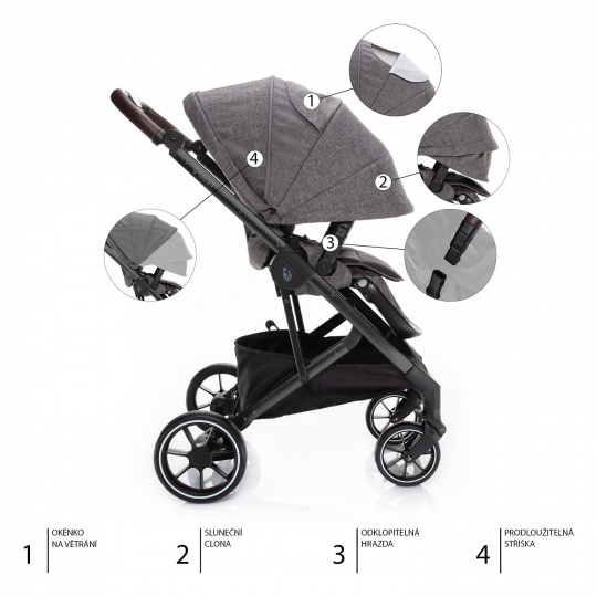 Další nezbytnou součástí kočárku je prostorný košík s kapacitou až 5 kg, který vám umožní mít všechny důležité věci vždy při sobě. Součástí kočárku je navíc i pláštěnka a nánožník.