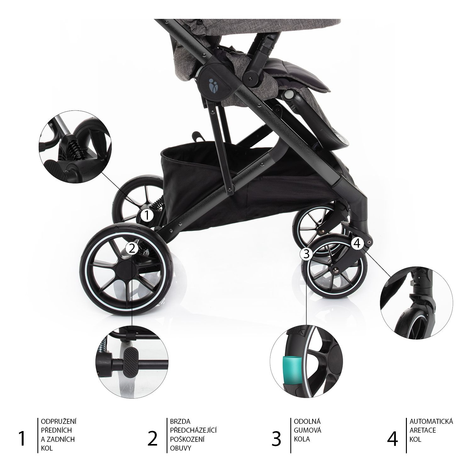 Další nezbytnou součástí kočárku je prostorný košík s kapacitou až 5 kg, který vám umožní mít všechny důležité věci vždy při sobě. Součástí kočárku je navíc i pláštěnka a nánožník.