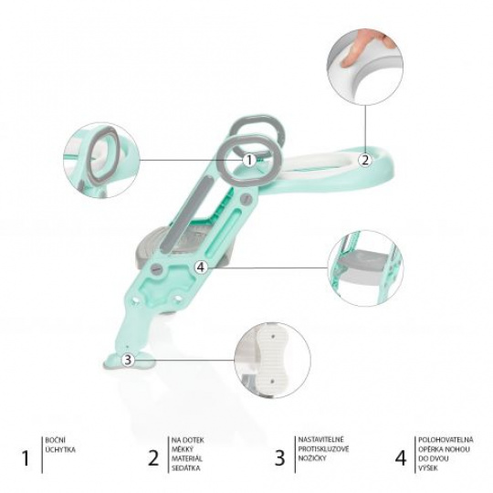 Schůdky jsou vhodné pro děti od 1 roku a díky výškové nastavitelnosti porostou s vaším dítětem až do doby, kdy už je nebude potřebovat. Pevná konstrukce zaručuje, že se dítě bude při šplhání i sezení cítit bezpečně. Nohy jsou vybaveny speciální protiskluzovou vrstvou, která poskytuje pocit stability a opory. Součástí schůdků je také měkký a pohodlný sedák, který slouží jako redukce na klasický záchod. Anatomický tvar sedáku spolu s vyvýšenou zadní stranou dokonale zabraňuje nechtěnému znečištění.