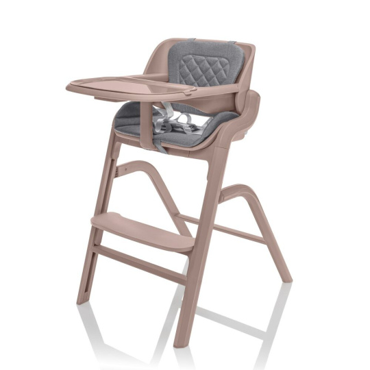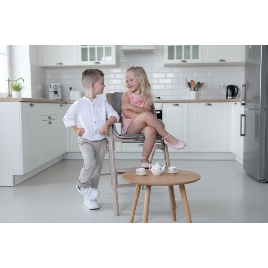 Jakmile dítě začne samostatně sedět, jednoduše odejmete novorozenecký set a získáte vysokou jídelní židličku s praktickým odnímatelným pultíkem. Sedák i opěrku nohou lze výškově nastavit tak, aby se přizpůsobily každé fázi růstu.
