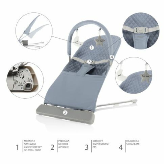 Perfektní odpočinek vašemu děťátku zajistí příjemné vibrace, 2 polohy zádové opěrky, pohodlné polstrování, které je navíc v moderním designu, jež se hodí do každé domácnosti. Čas strávený v lehačce dokáže být nejen odpočinkem, ale také zábava díky hrazdě na hračky, která stimuluje smysly miminka.